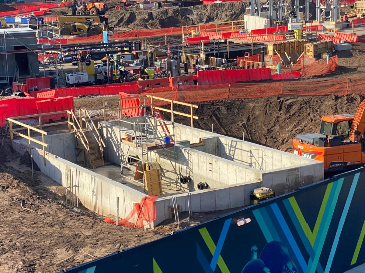 Deeper into the site, dirt mounds show off just how much has been dug up during construction.