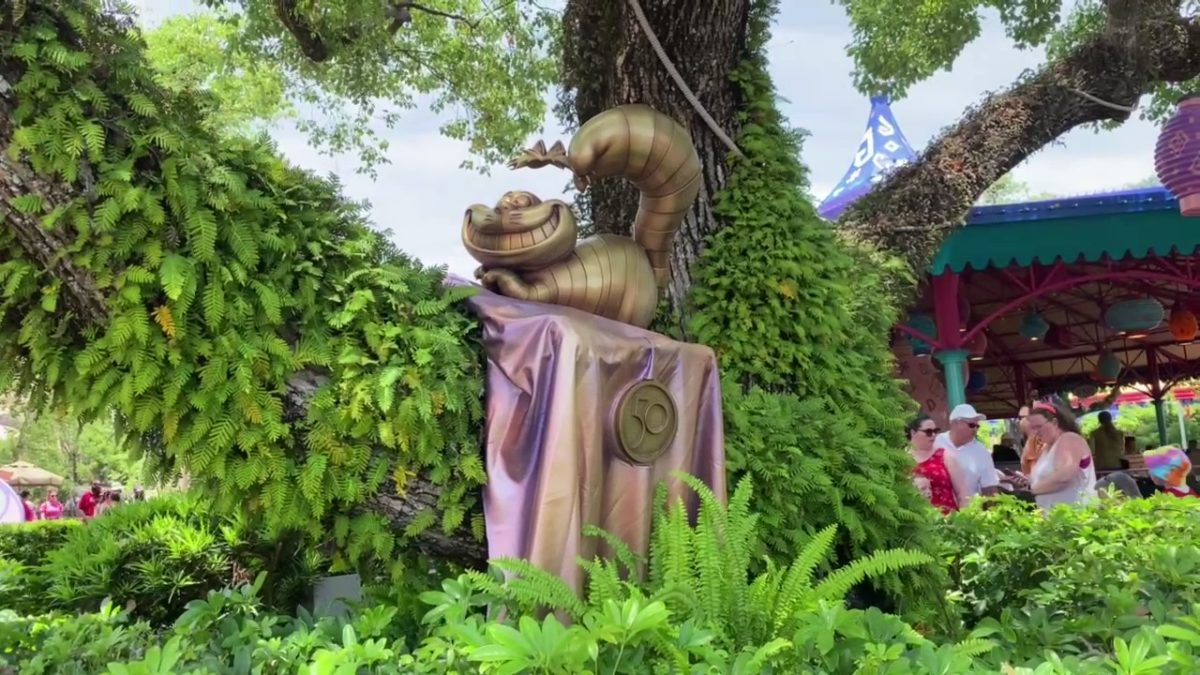 Passing by the statue of the Cheshire Cat, we first heard the general park music, then a second sting inspired by the music of “Alice in Wonderland.”