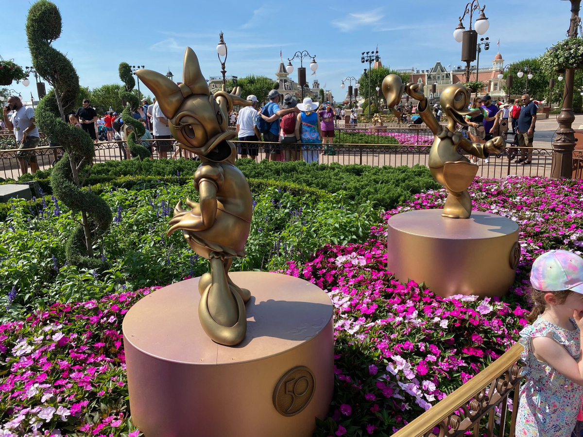 A similar situation occurred at the statues of Donald and Daisy Duck, with Donald’s sounds coming from the speaker near Daisy’s statue. On our first pass, we heard Donald’s angry quack, with him much happier on the second try, where he said “Oh boy, oh boy, this is fun!” We then heard “Hi, everybody, it’s me, Donald!” Daisy finally showed up on the fourth try, saying “Oh! I love magic!” Donald returned on attempt number five, saying “I’m here, everybody!” Each statue has its own cartoonish theme music.