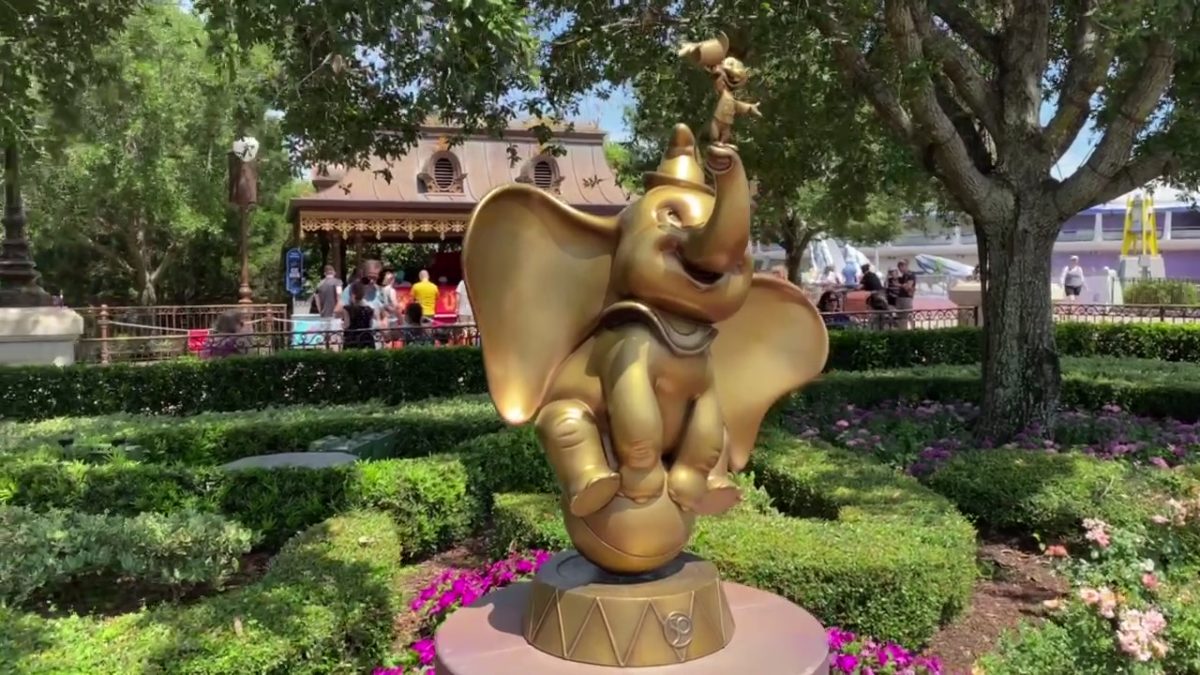 By the statue of Dumbo and Timothy Q. Mouse, we heard the Magic Kingdom music, as well as a jaunty circus-like song reminiscent of “Casey Junior.”