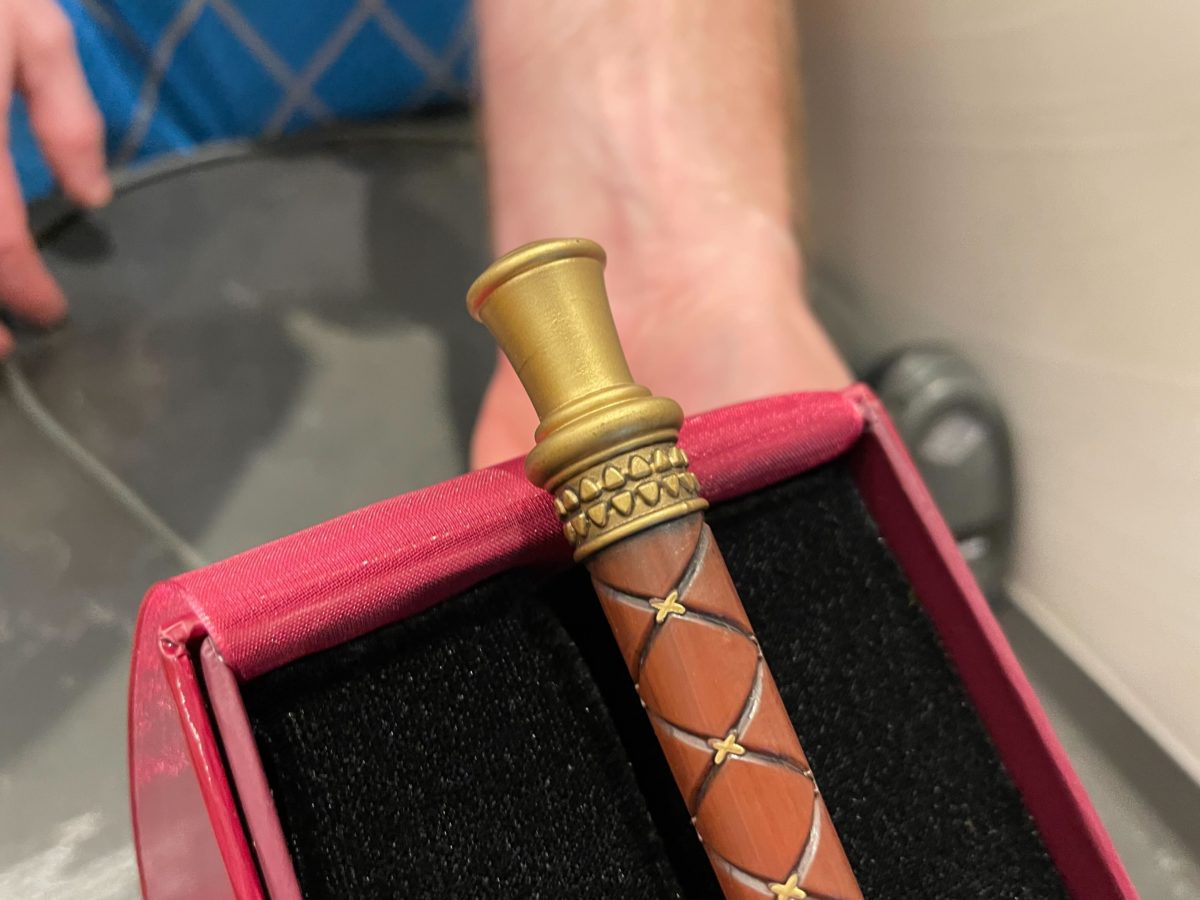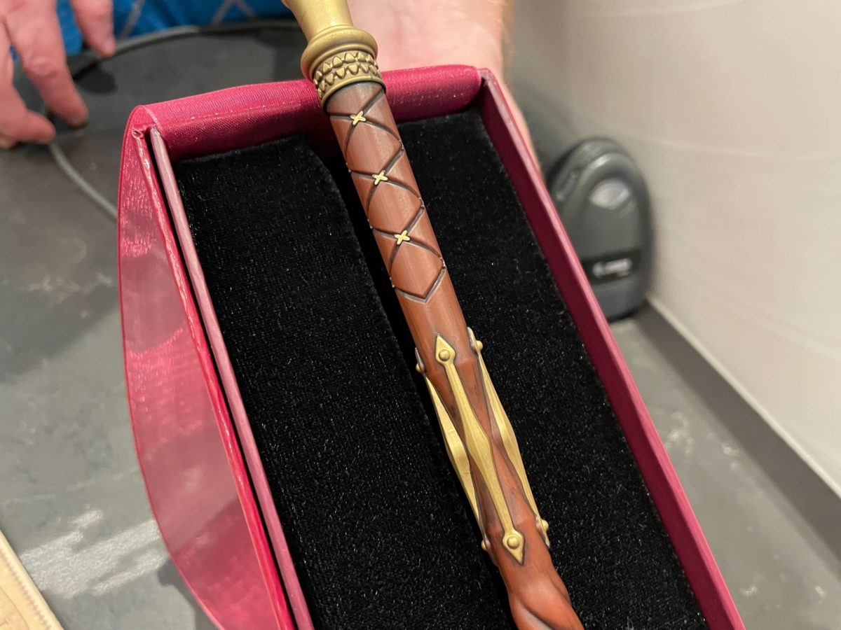 The wand has a spiral center and gold accents. The end of the wand has a golden knob.