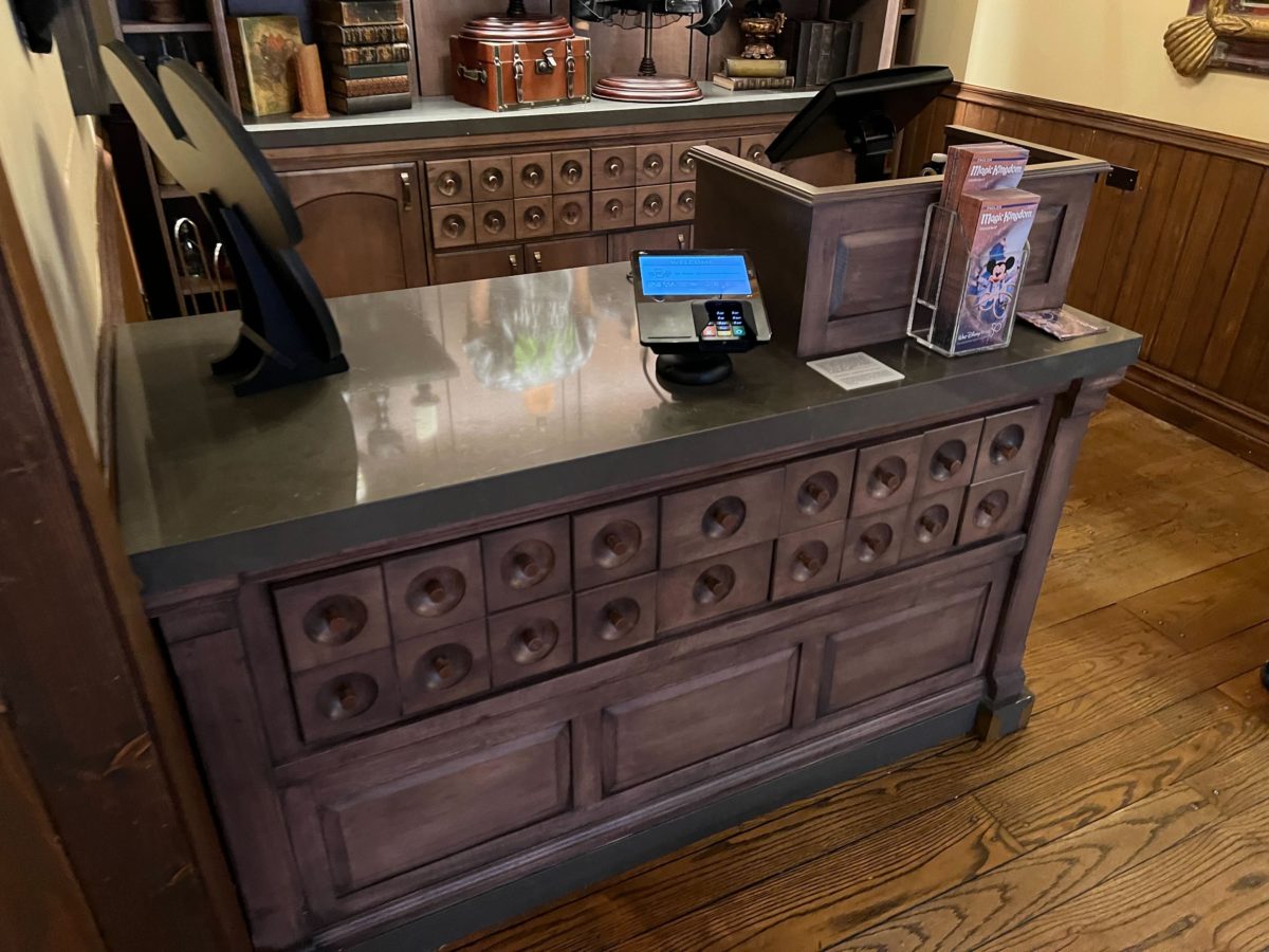 The table the register sits on resembles a gorgeous antique wooden desk, which enhances the stately look of the place.