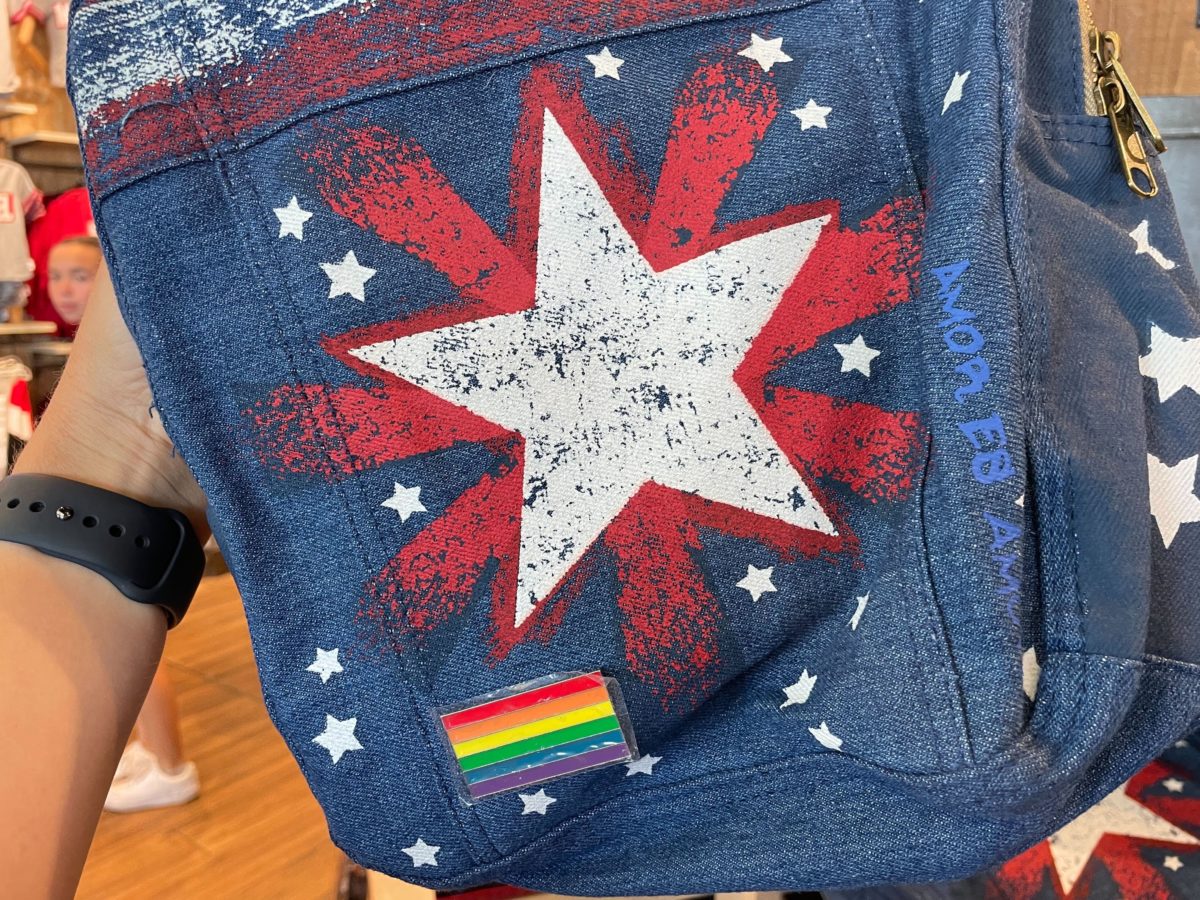 Smaller white stars are around the large one and a rainbow pride pin is in the corner.