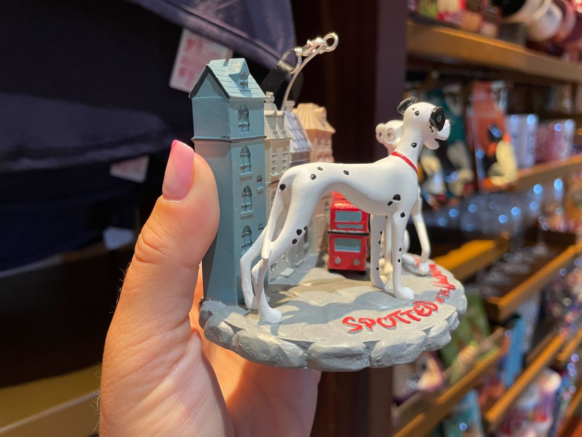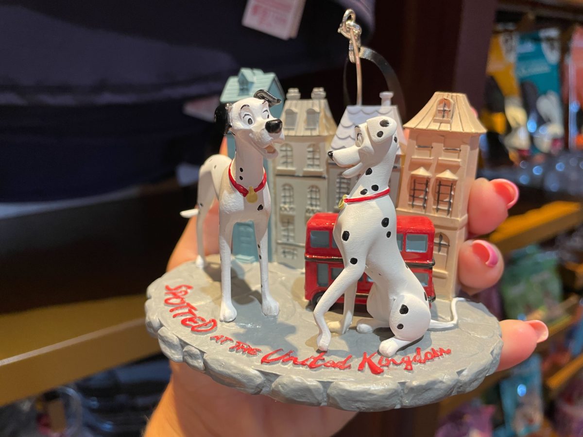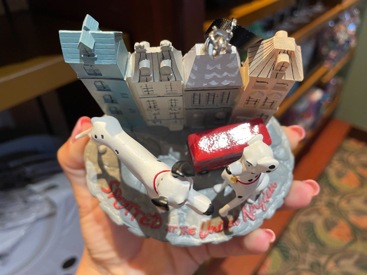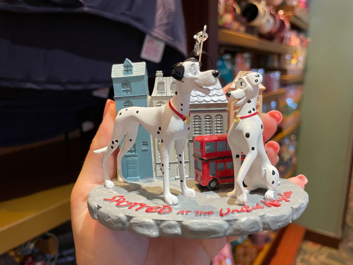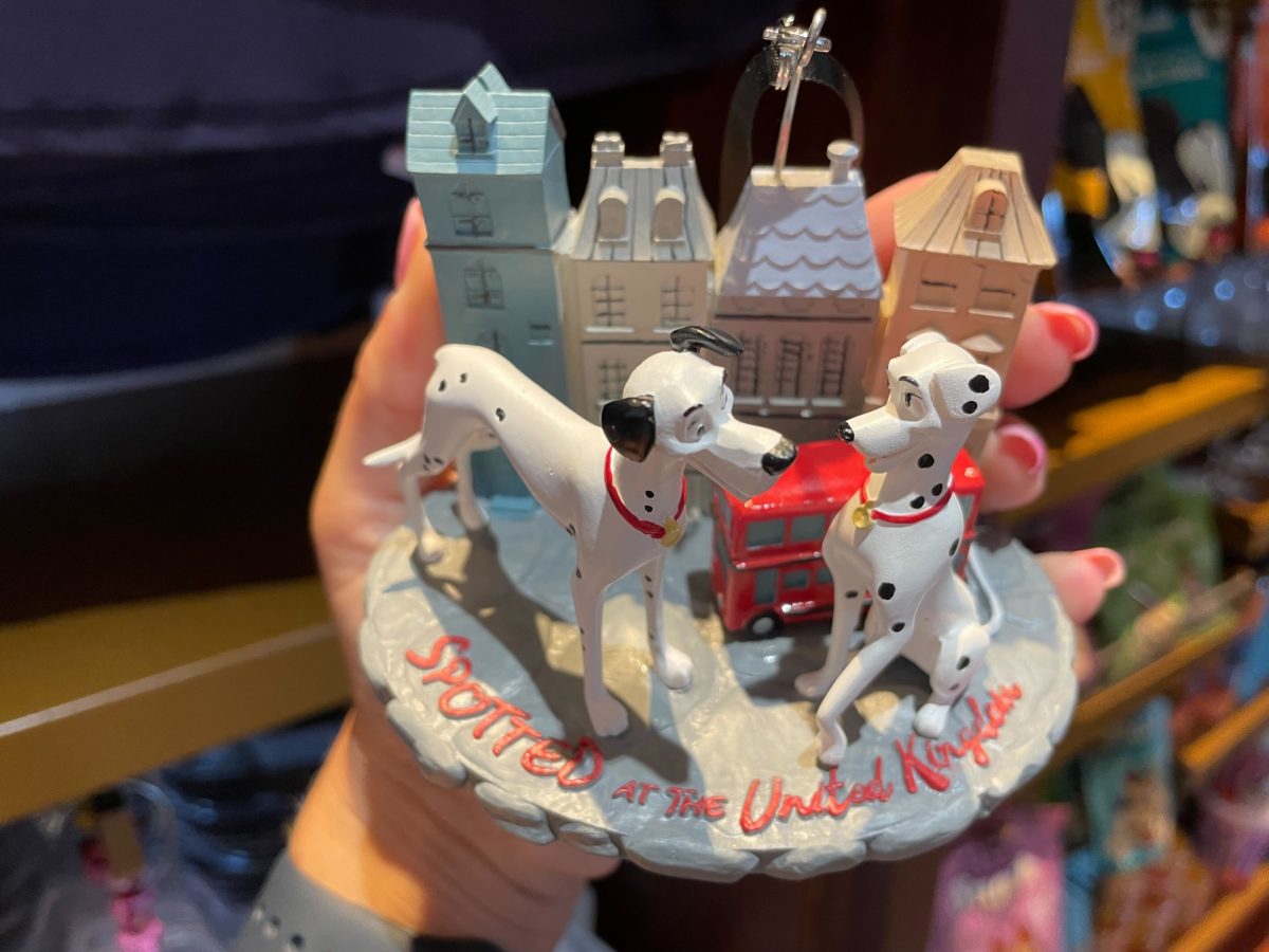 This ornament features a London street, double-decker bus, and Pongo and Perdita from “One Hundred and One Dalmatians.”