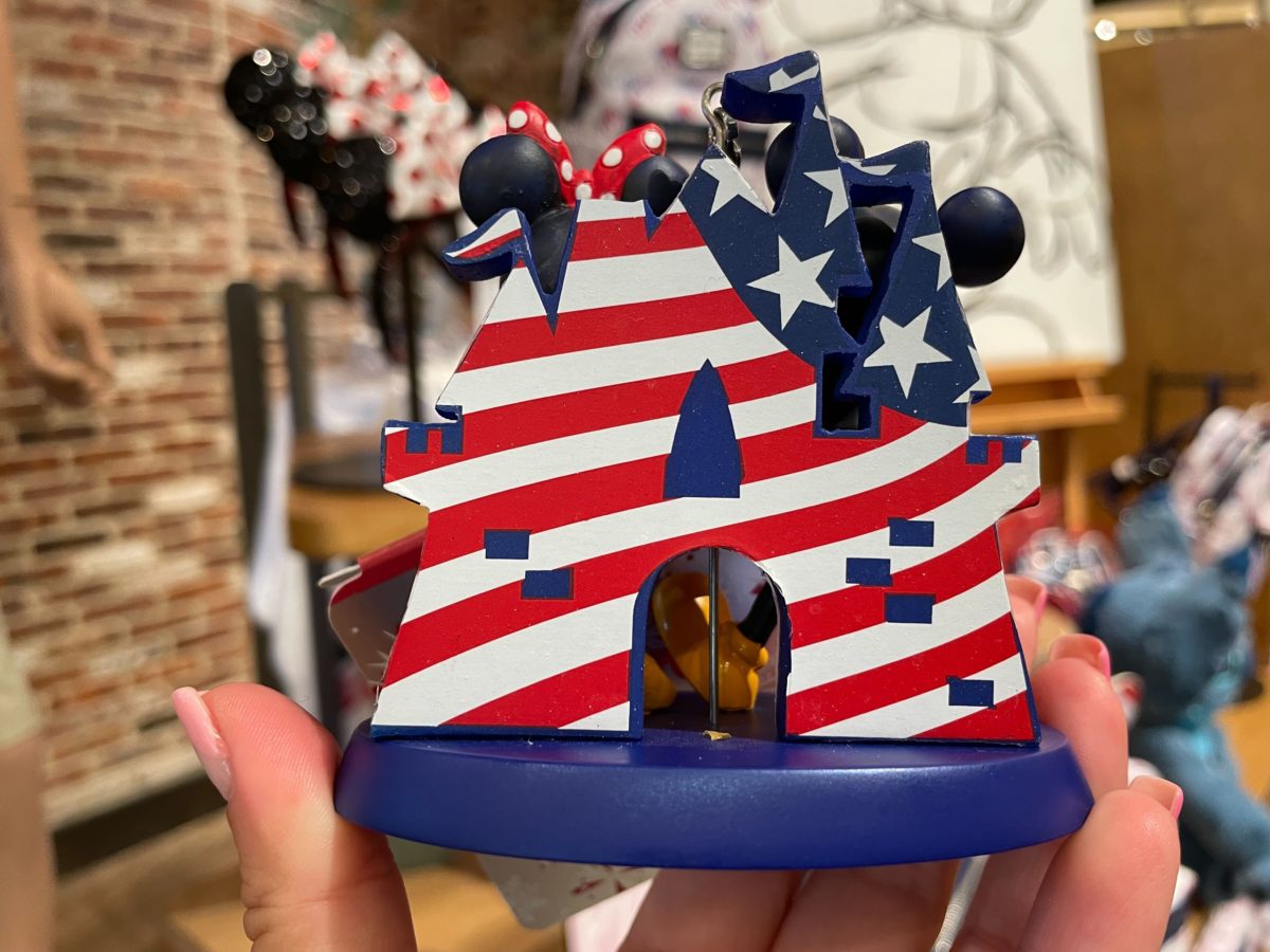 Sleeping Beauty Castle, decorated like the American Flag, is behind them.