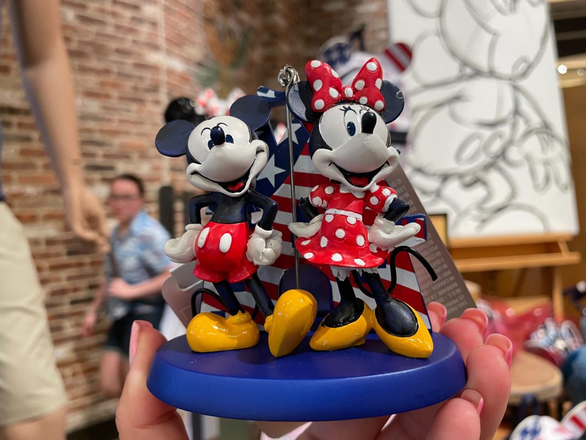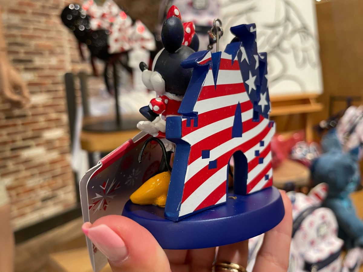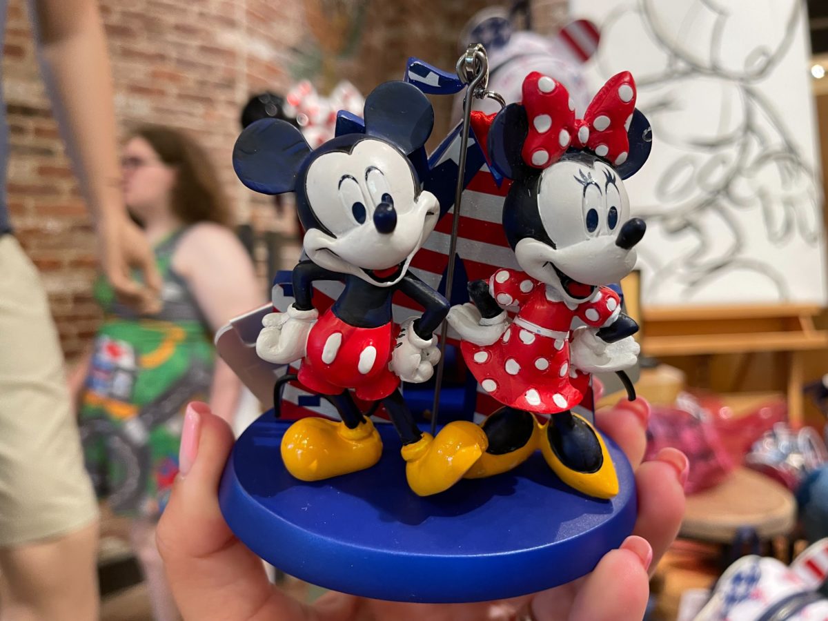 This ornament features Minnie and Mickey, standing atop a blue base.