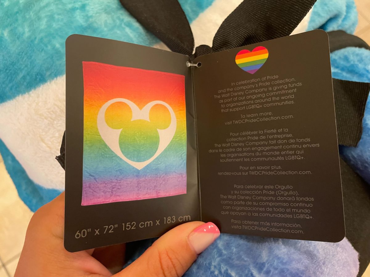 The tag shows off the full throw design, which is an ombre rainbow with a heart in the center. A rainbow Mickey head is at the center of the heart.