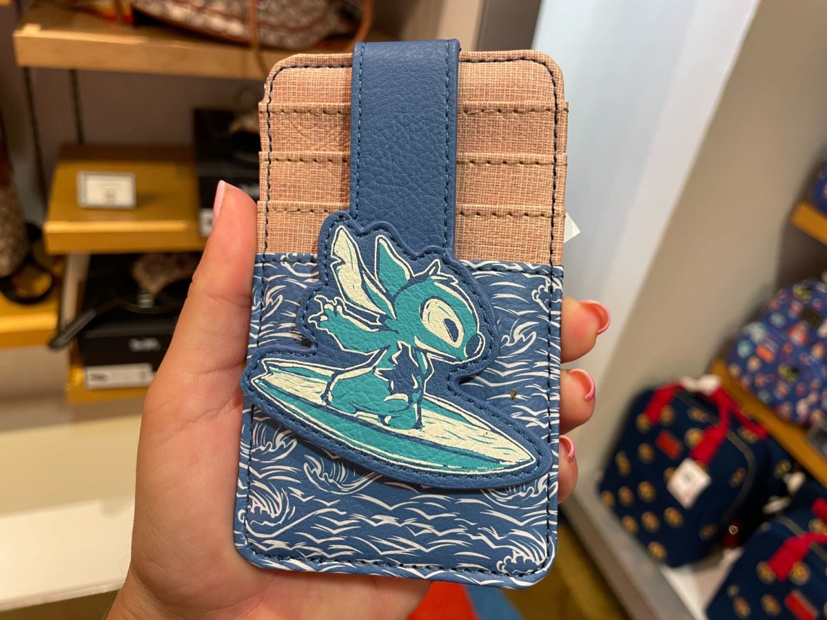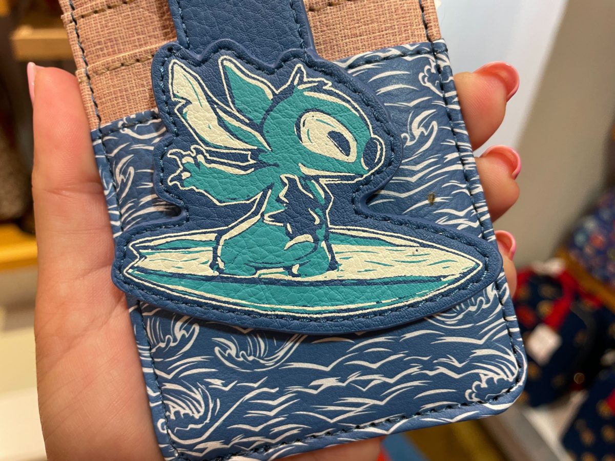 This cardholder features Stitch surfing on the magnetic clasp.