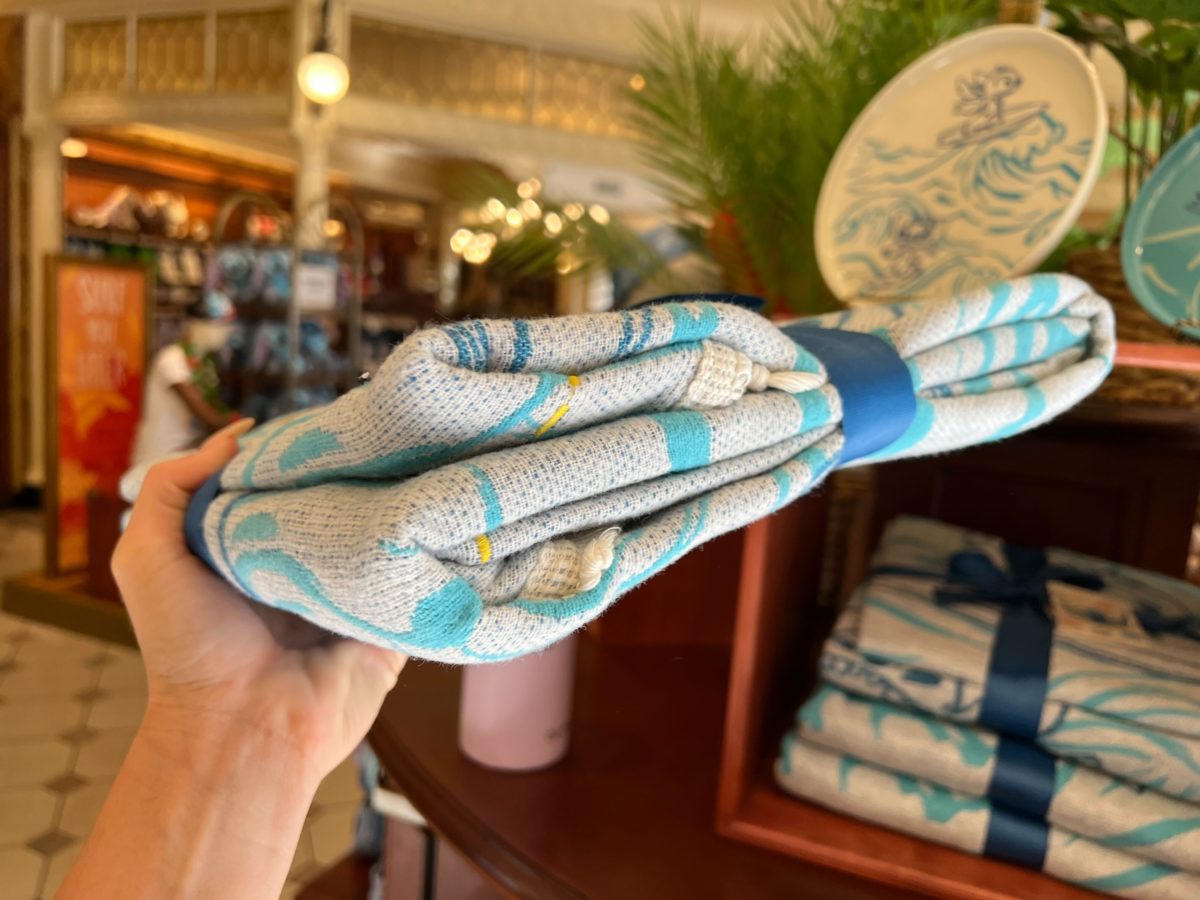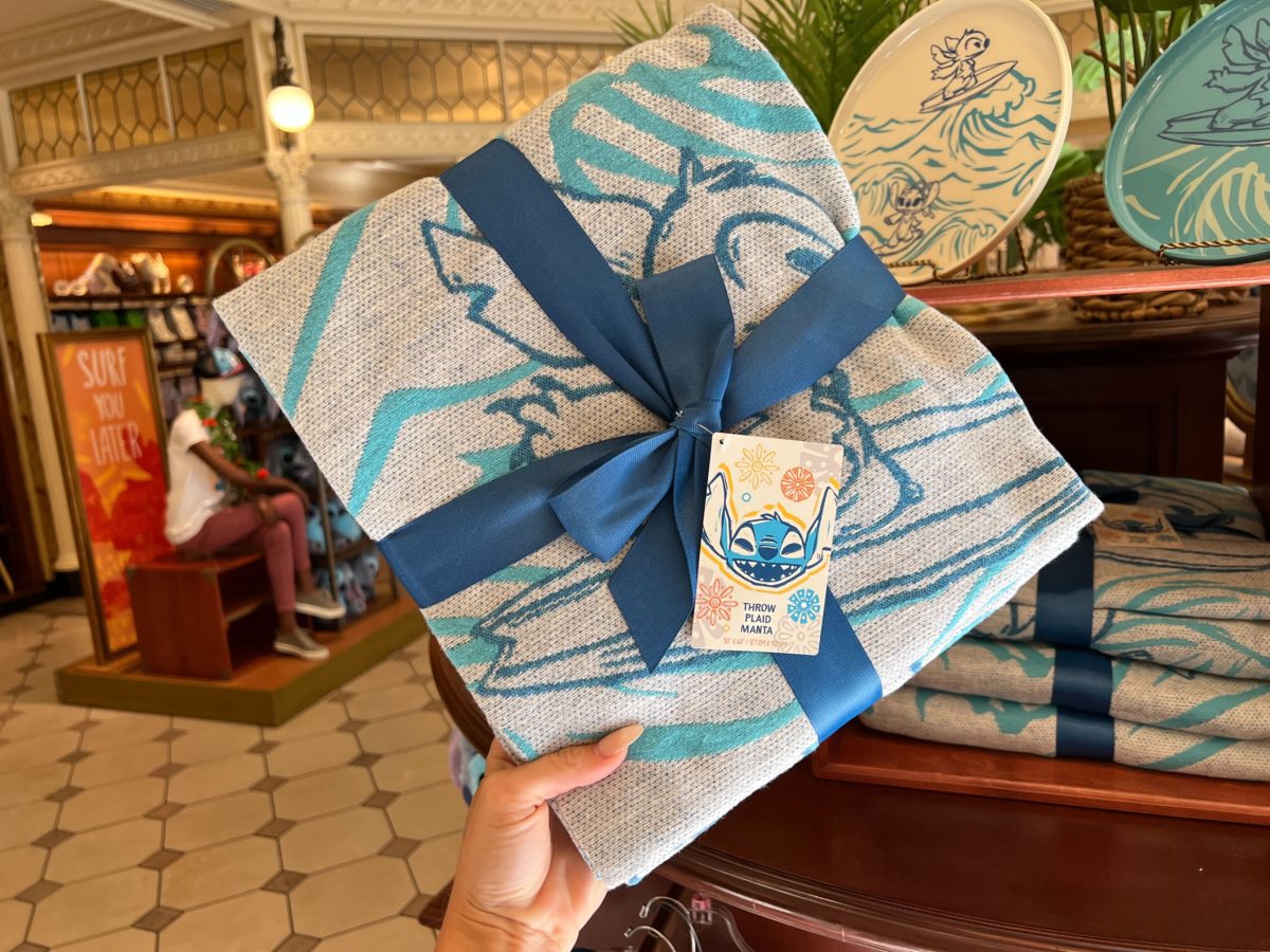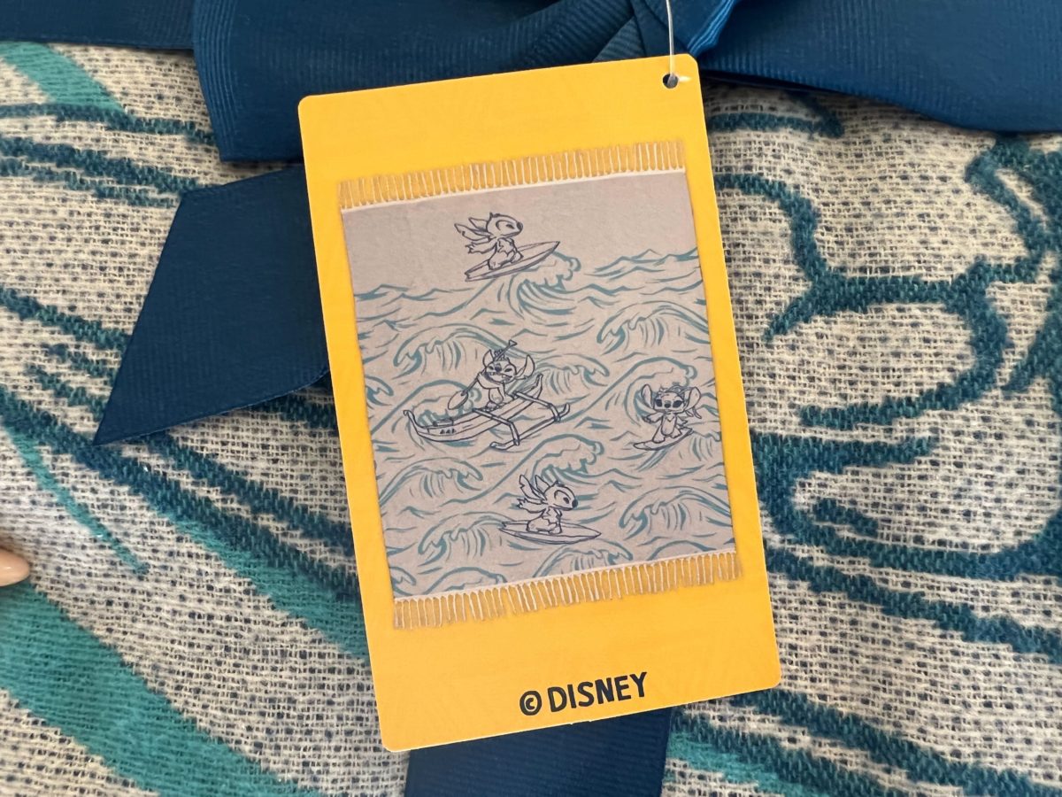 The tag shows what the unfolded throw looks like. It’s white and covered in blue waves. Stitch is featured on a surfboard and in a canoe. Angel is also surfing.