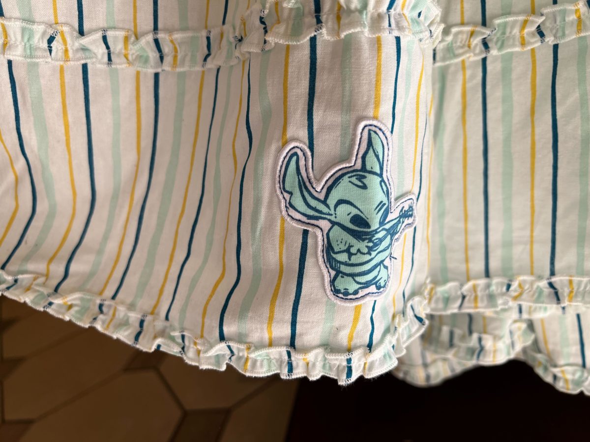 A teal patch of Stitch playing guitar is on the skirt.