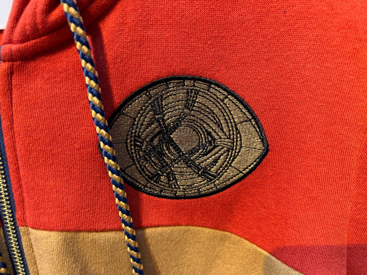 The seal of Vishanti is embroidered on the left breast. It zips up and has a gold and blue drawstring on the hood.