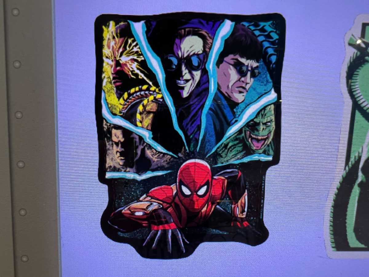 Spider-Man crawls forward on this magnet, with the villains of “No Way Home” behind him.