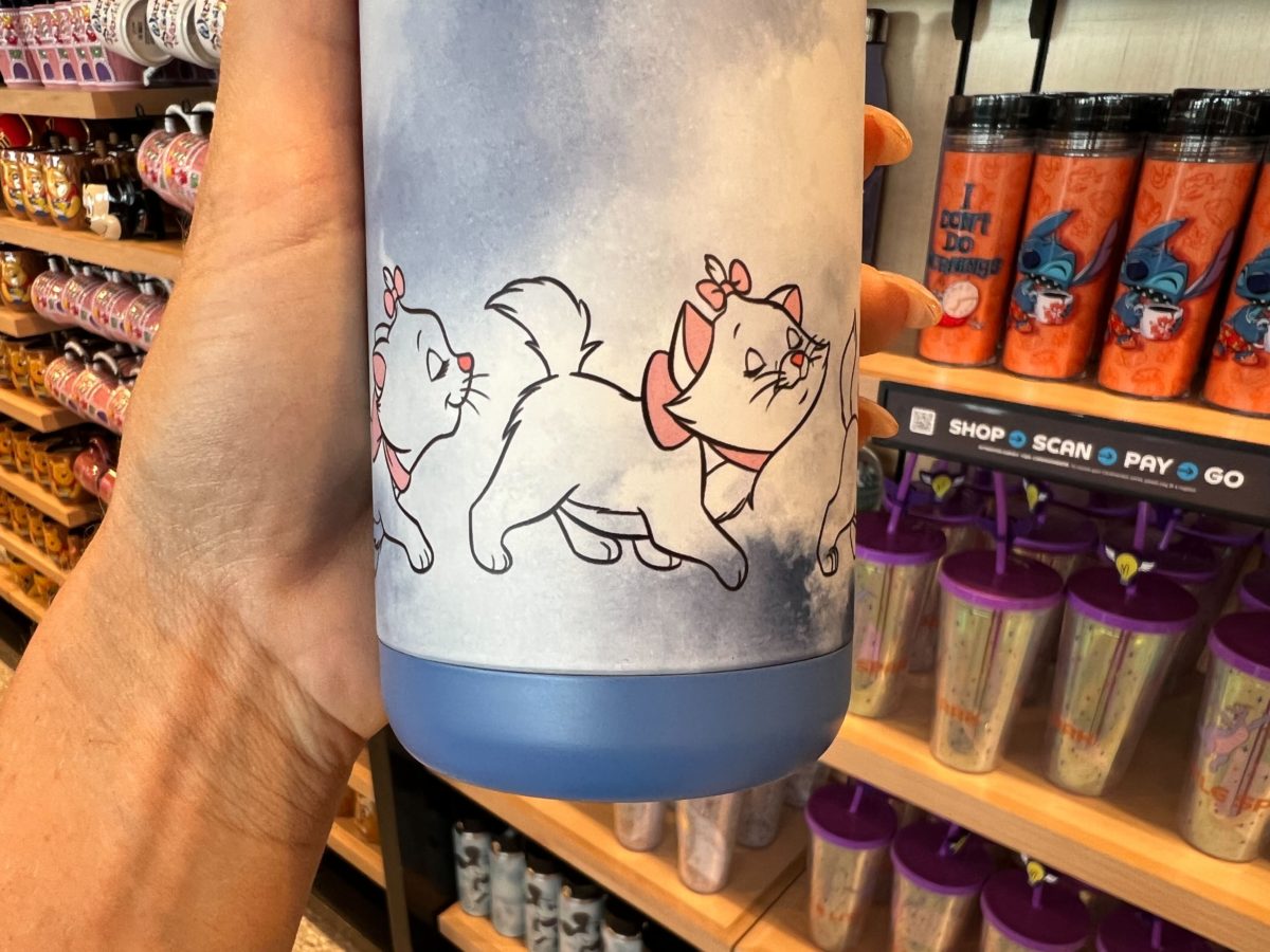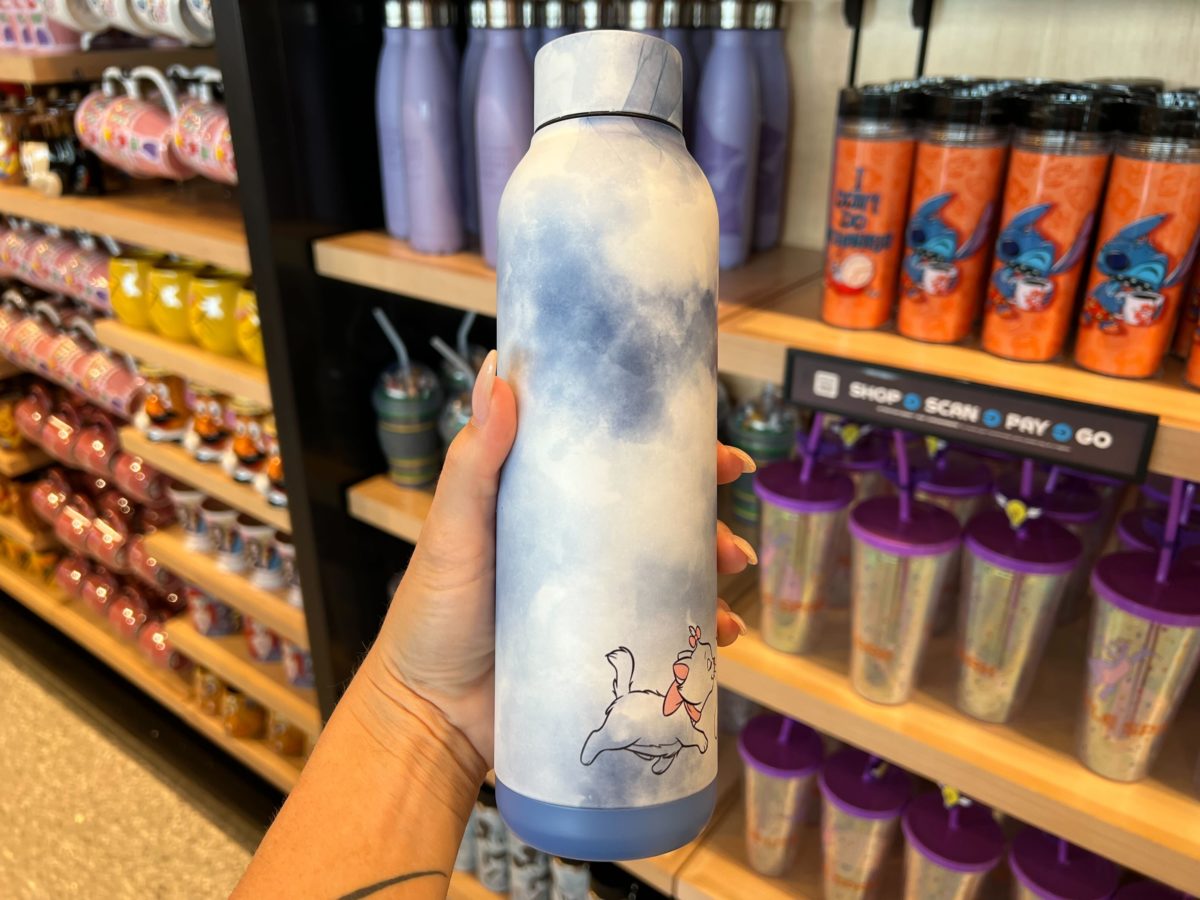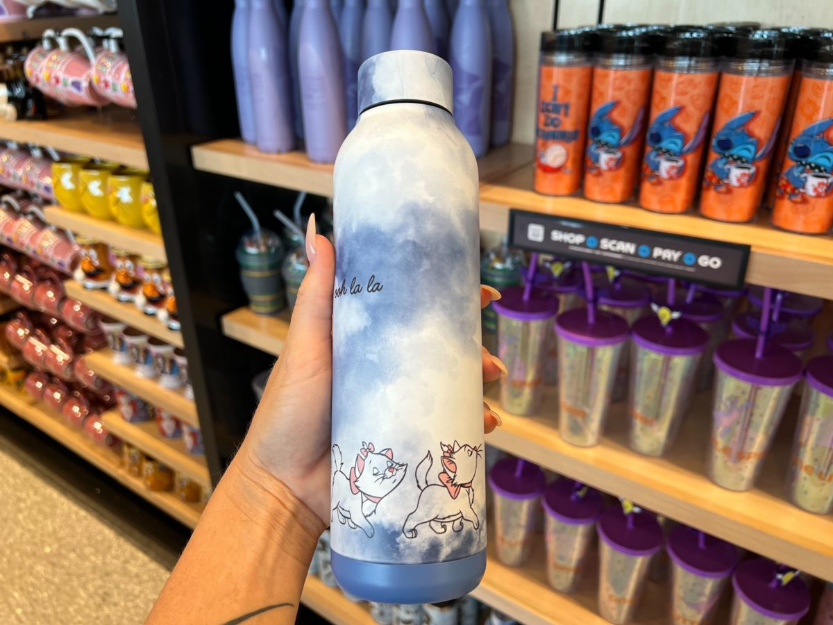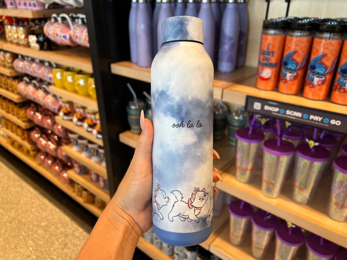 This blue and white tie-dye bottle has images of Marie along the bottom. “Ooh la la” is in black cursive on one side.