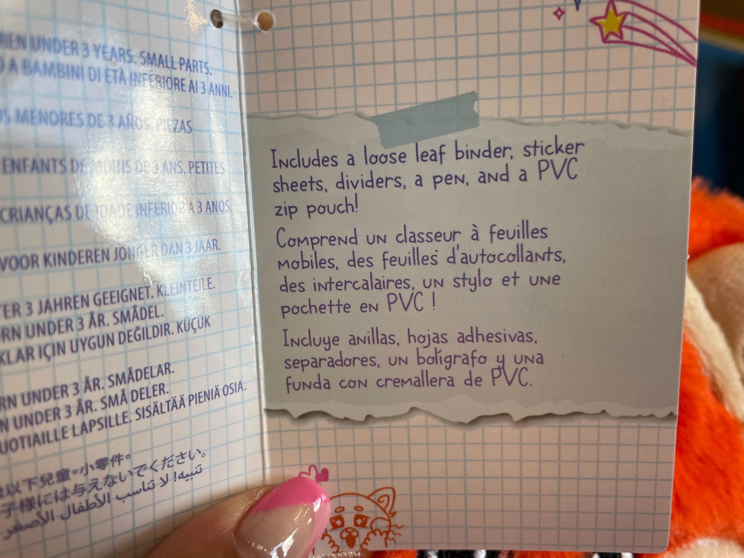 Inside is a loose-leaf binder, sticker sheets, dividers, a pen, and a PVC zip pouch.