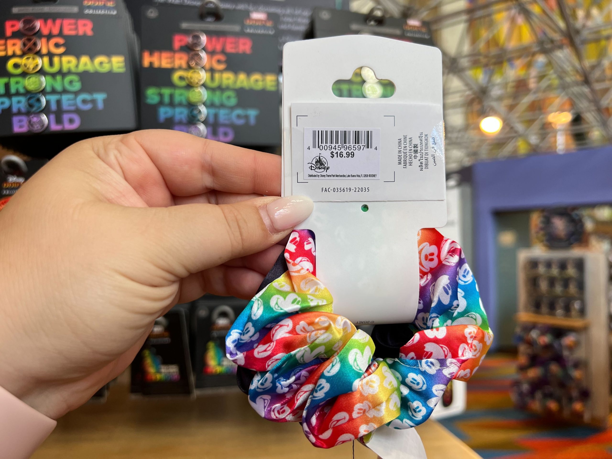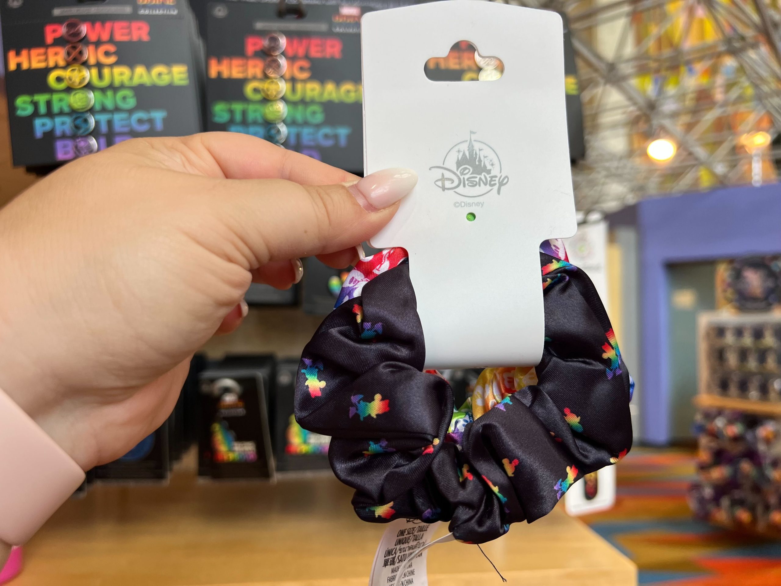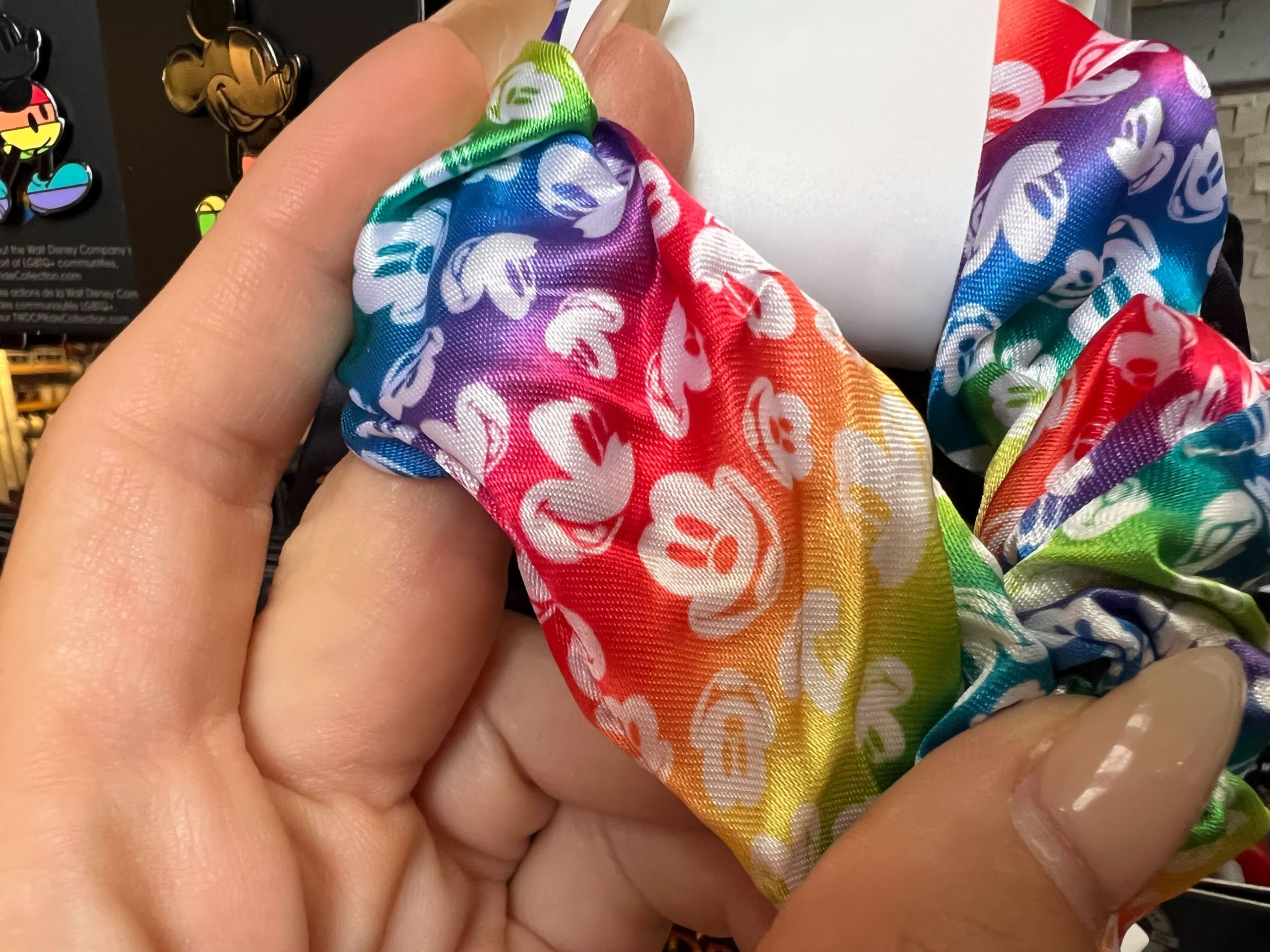 The other scrunchy is rainbow with images of Mickey’s face.