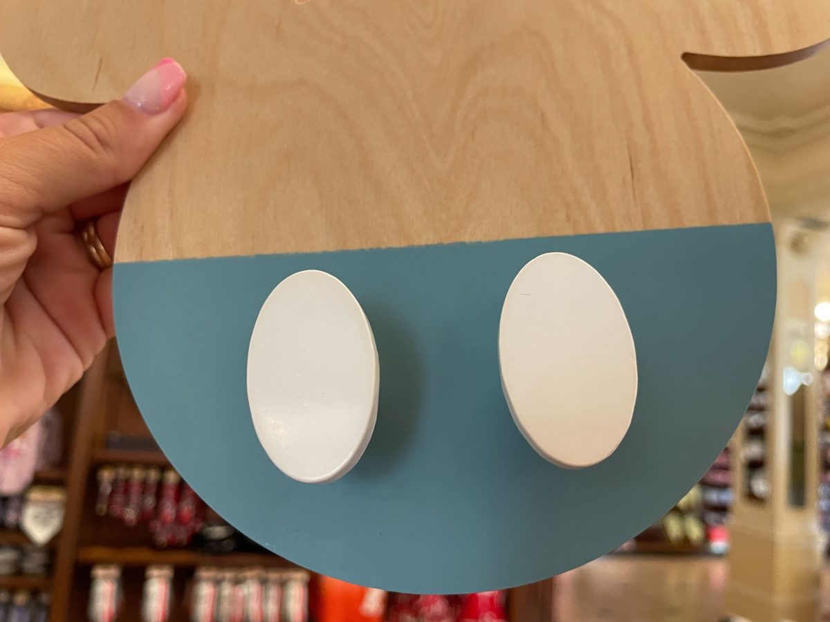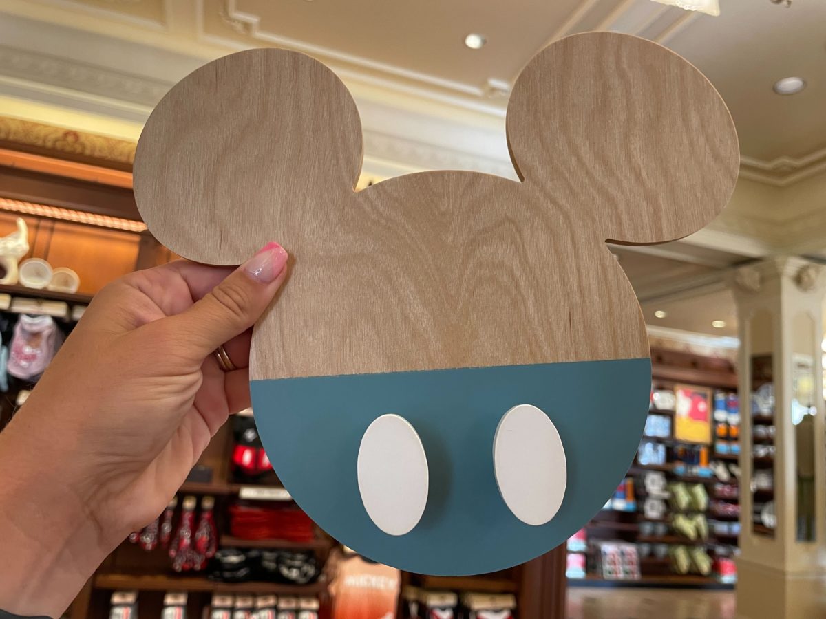 This Mickey-shaped piece hangs on the wall. Half is painted blue with two white buttons like Mickey’s shorts.