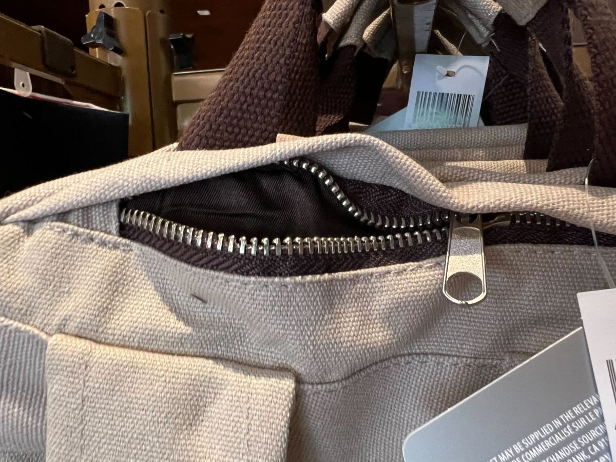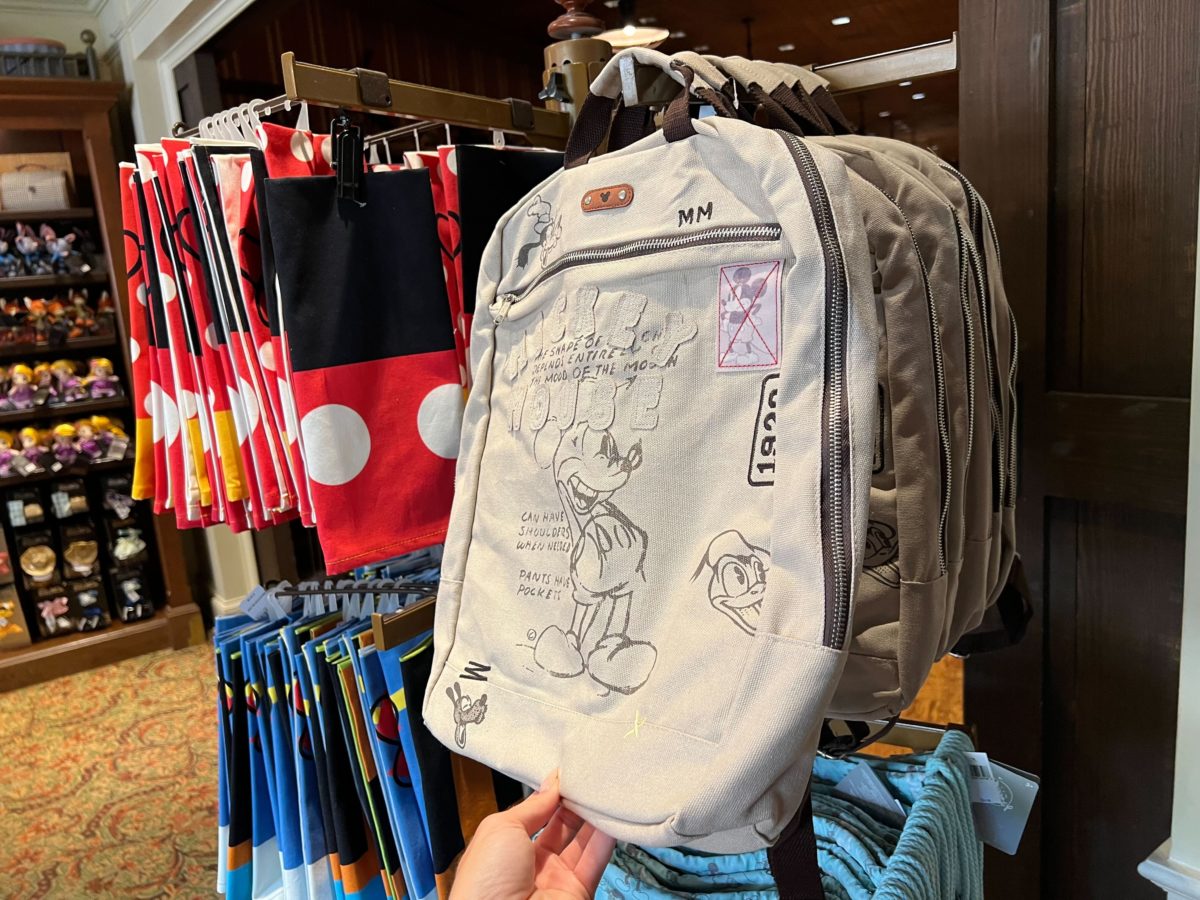 It’s a grey color, with sketches of Mickey and some of his friends on the front.
