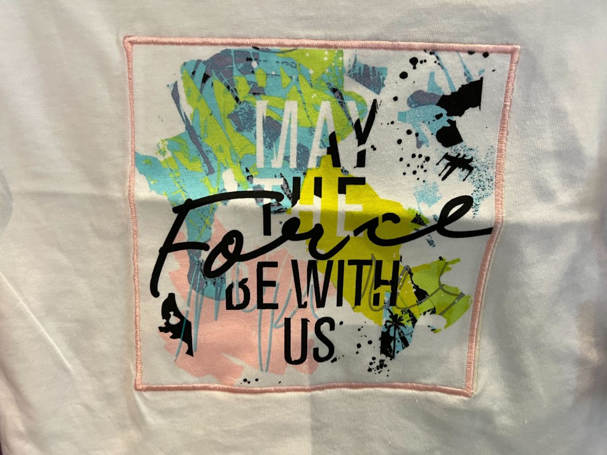 Graffiti-like splatters of color are within the square with the words “May the Force be with us.”
