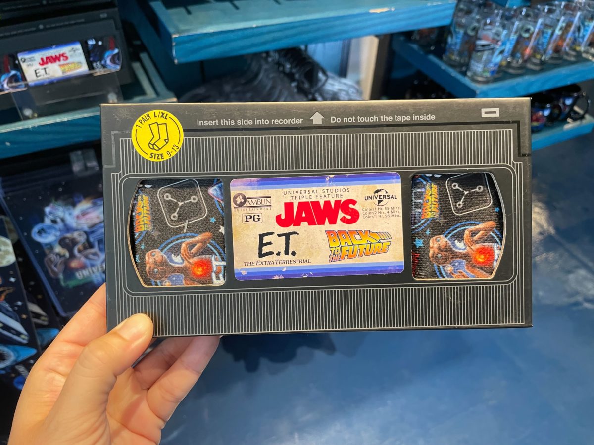 New socks inspired by Universal’s classic movies “Jaws,” “Back to the Future,” and “E.T.” are available at Universal Orlando Resort. Though they match merchandise from the Tribute Store, we only found them in E.T.’s Toy Closet at Universal Studios Florida.