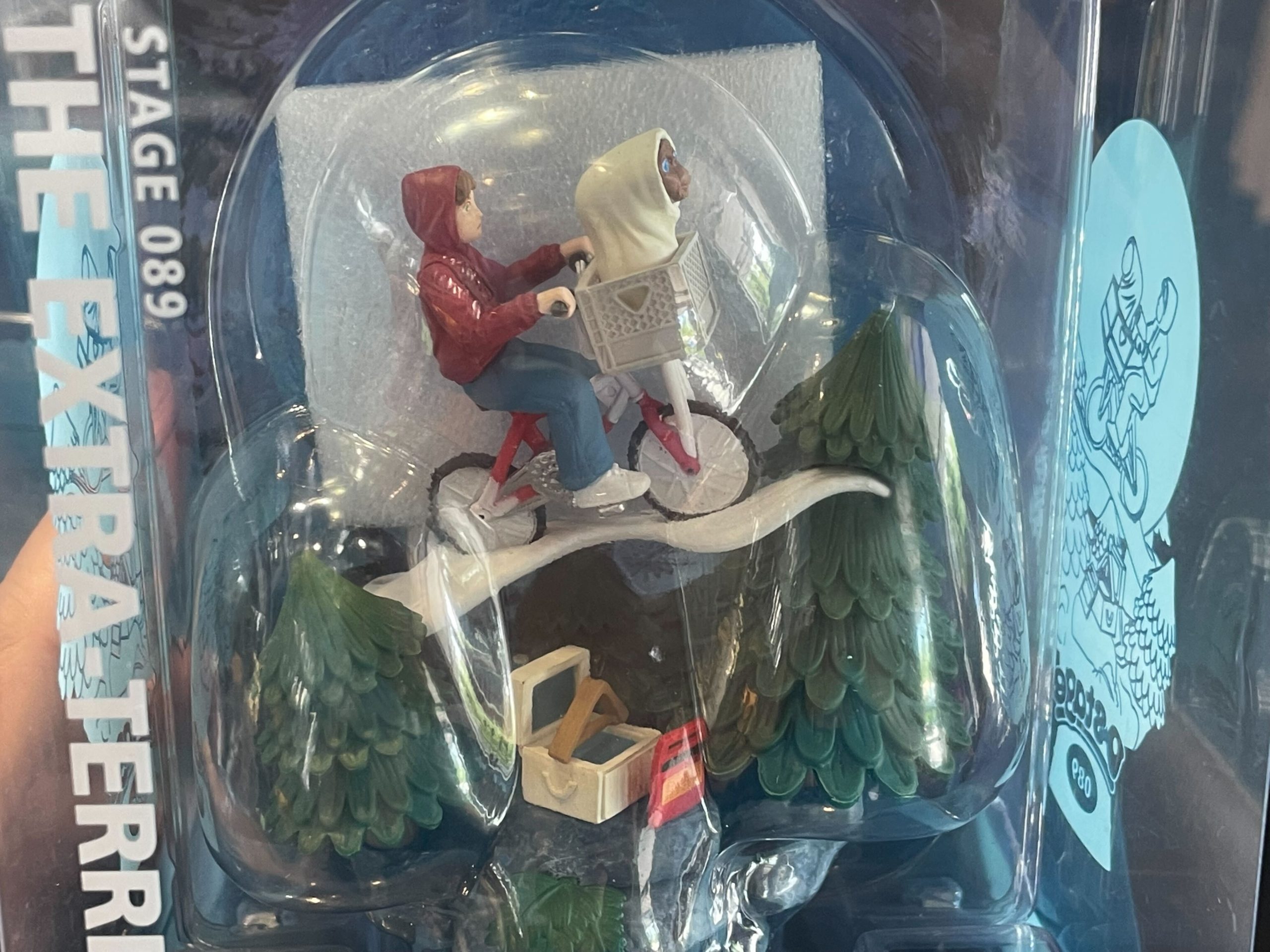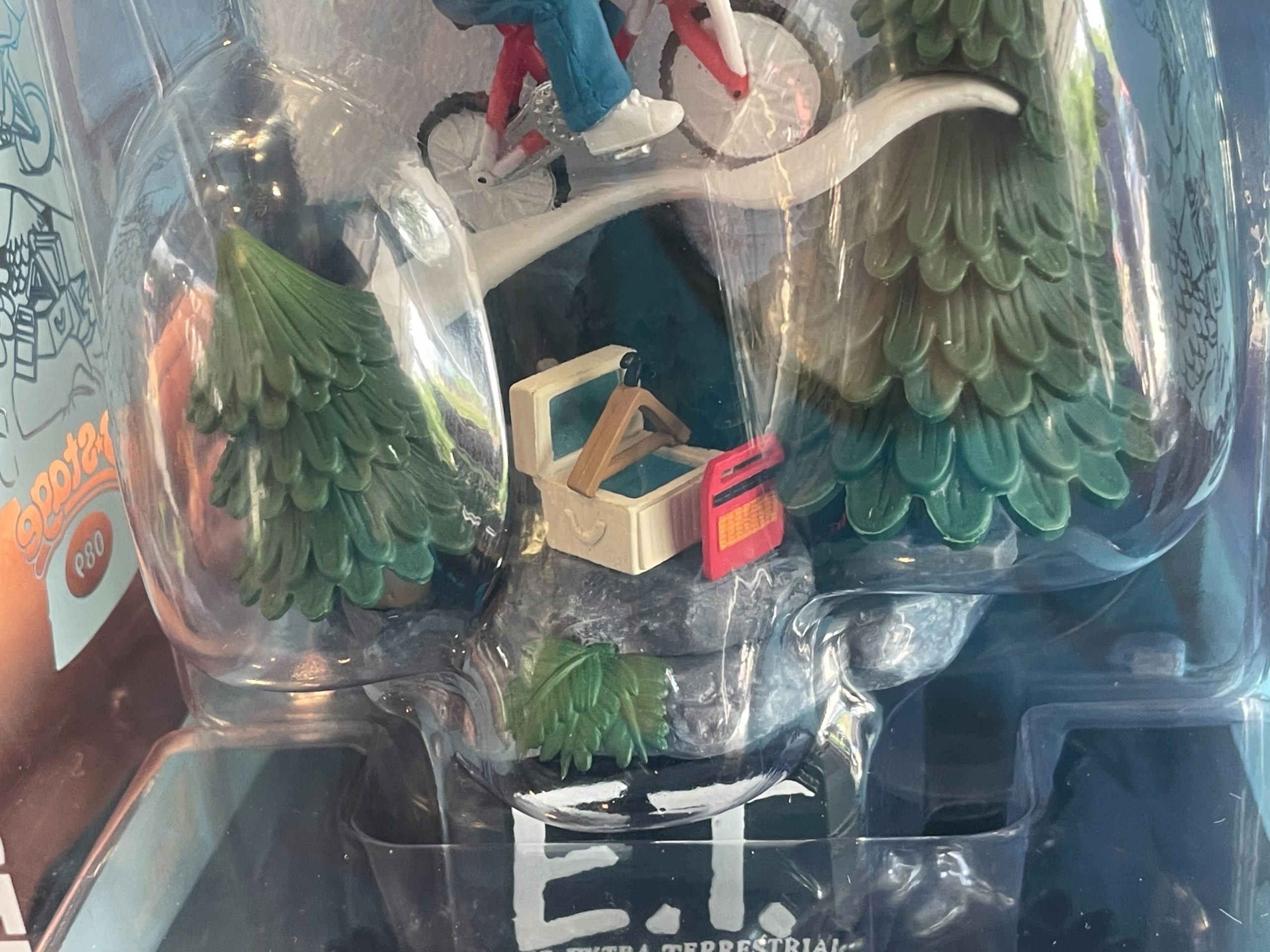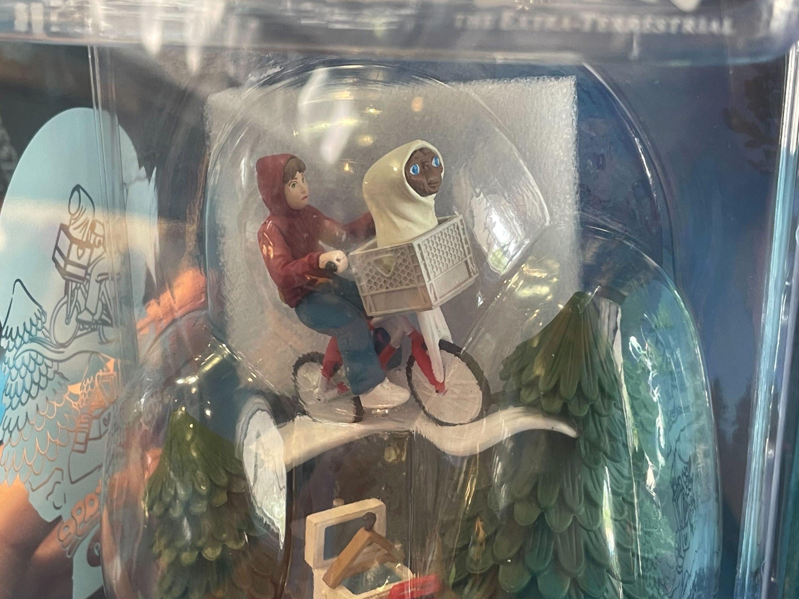 This is a diorama of the iconic film moment when Elliott rides his bicycle through the air, with E.T. in the basket.