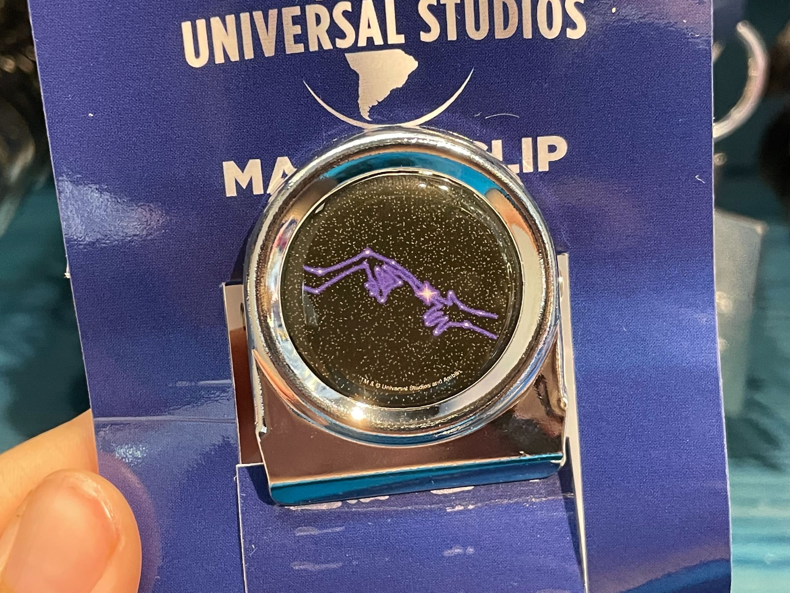 There are two similar magnet clips. Both feature a starry sky, with a design made out of purple lines.
