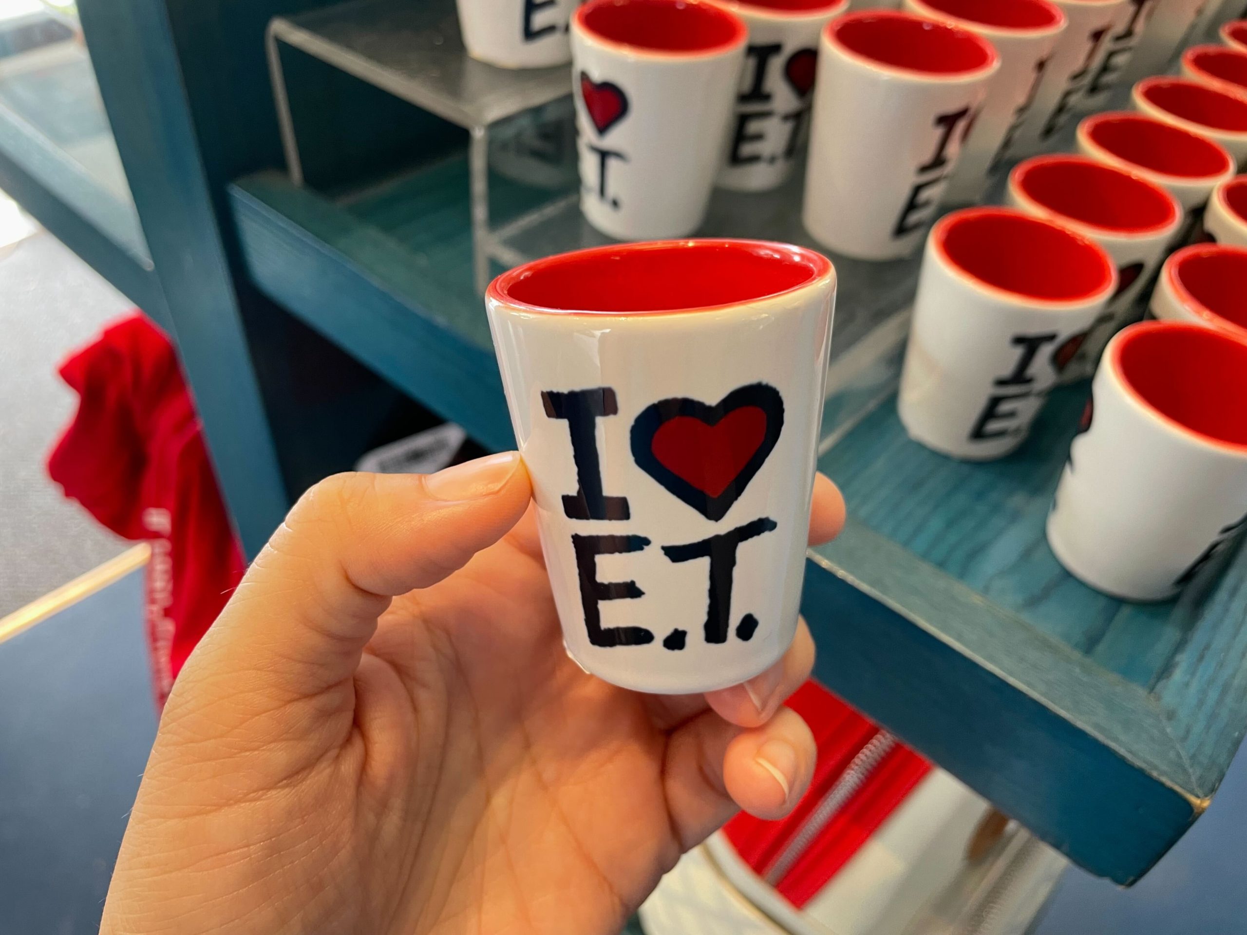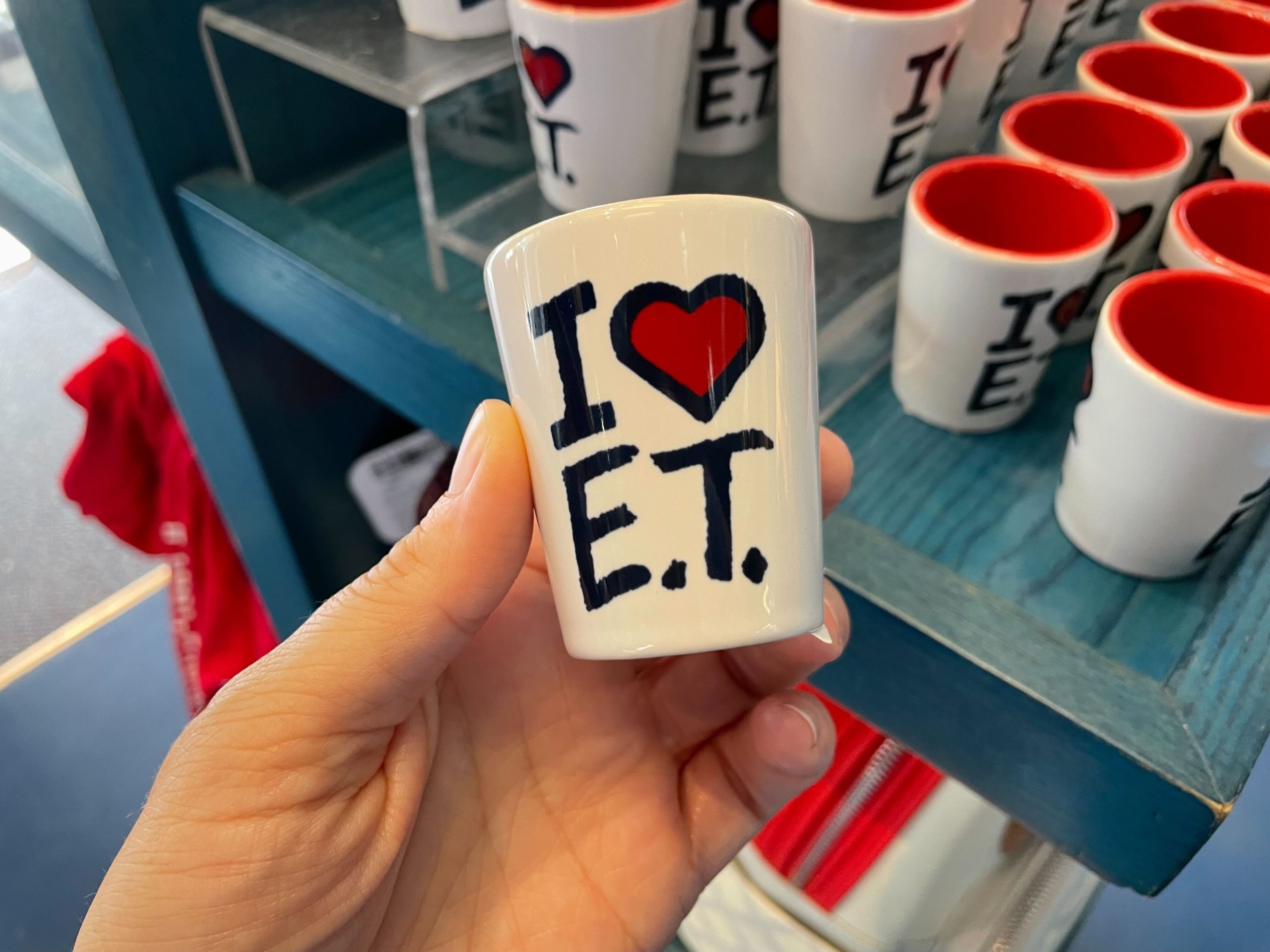 This white ceramic shot glass reads “I <3 E.T.” The letters are black, while the heart is red with a black outline.