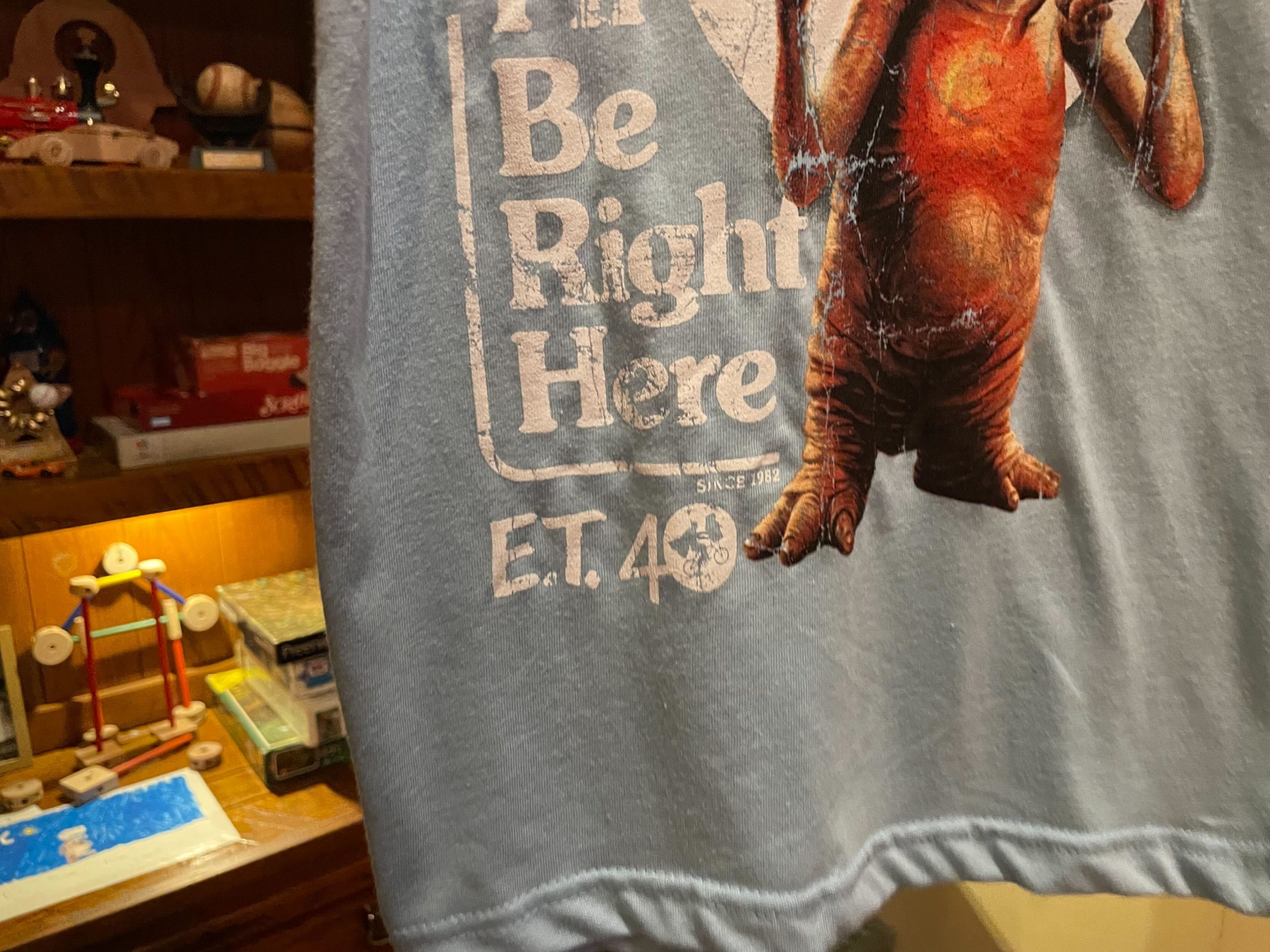 Finally, we found this blue shirt. It features E.T., with his finger and chest glowing. The moon is behind him, and so is the silhouette of him in Elliott’s bike.