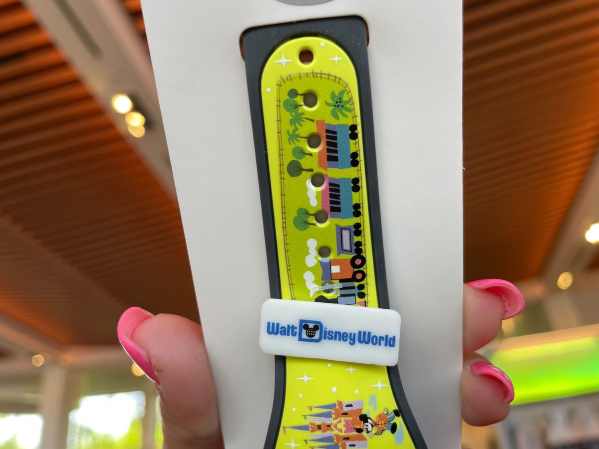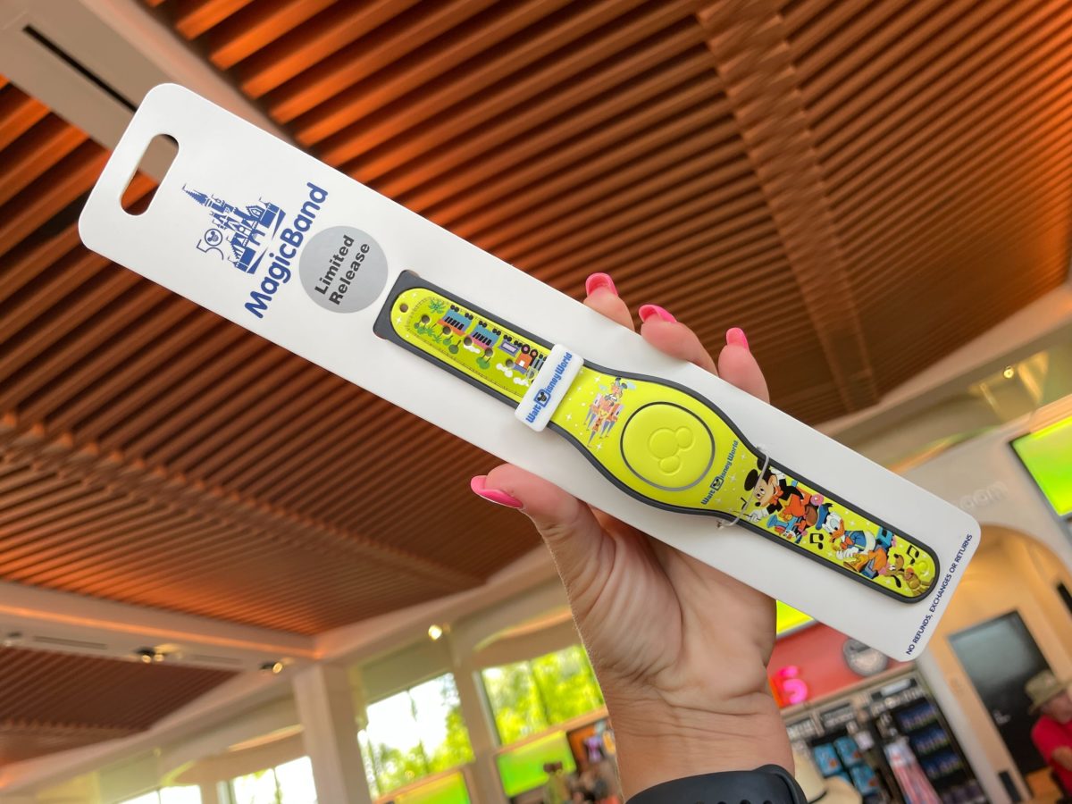 The MagicBand is lime green, with a white slider.