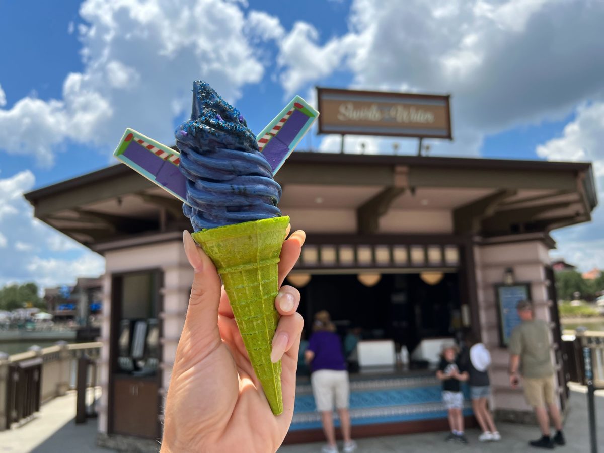 The Lightyear Ice Cream Cone is very pretty. The purple swirl, green cone, and white chocolate wings come together to create a dessert that appears fit for a Space Ranger. And galaxy sprinkles? An adorable touch.