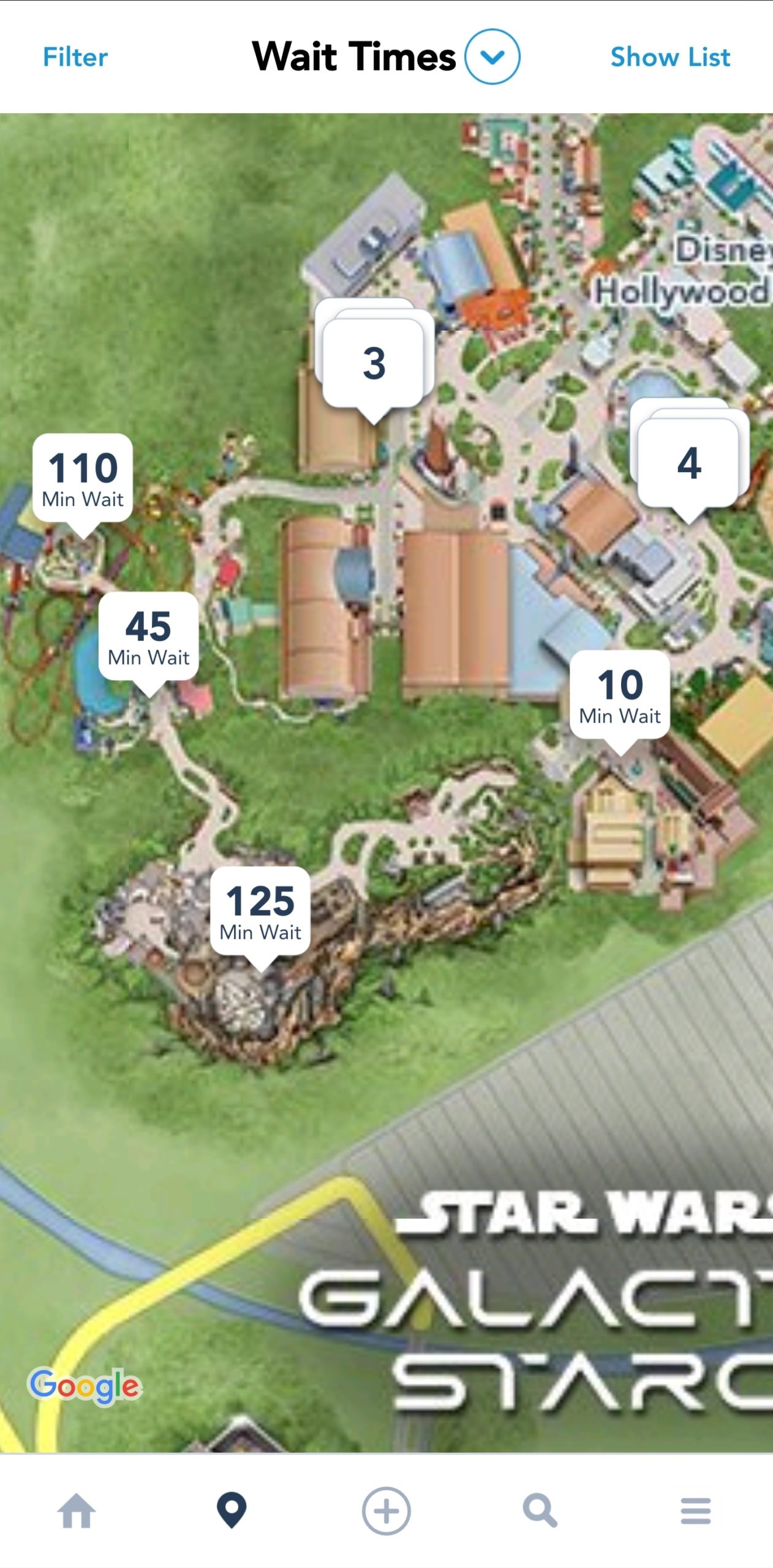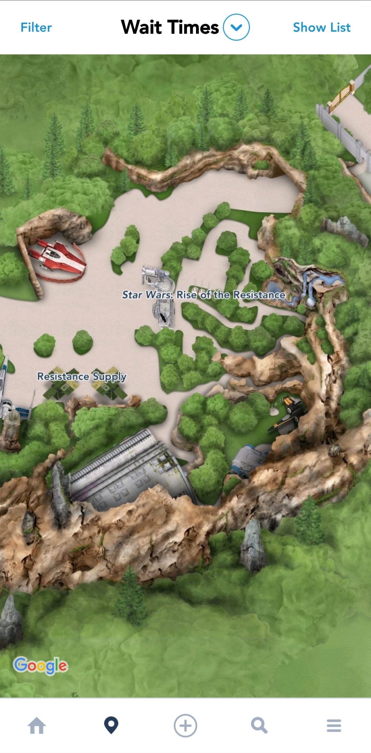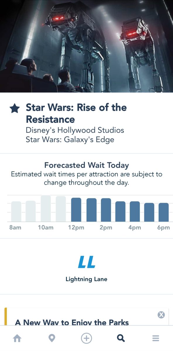 Attractions that are closed for unplanned downtime are usually represented with a star logo and a “Temporarily Unavailable” listing. But in the case of today’s downtime, Star Wars: Rise of the Resistance doesn’t appear on the map as an attraction.