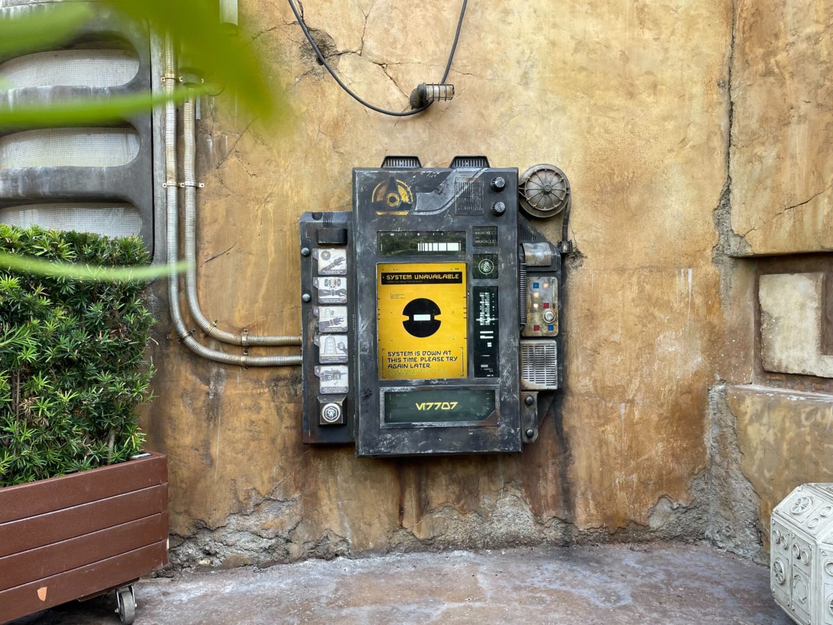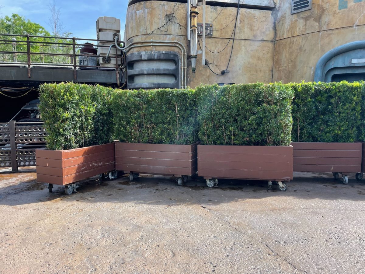Construction walls and now rolling planters have blocked a station for “Star Wars: Batuu Bounty Hunters.” We previously spotted a console on the wall through the planters.