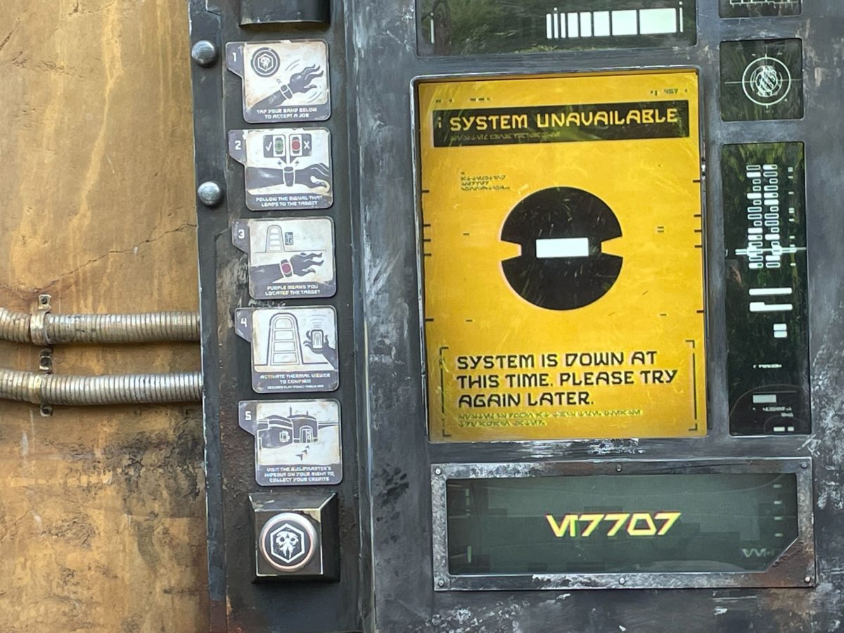 Right now, the screen reads “System Unavailable” and “System is down at this time, please try again later.” It flickers, but the image and words aren’t changing. The Aurubesh on the bottom reads “Error.”
