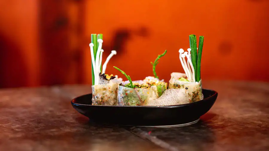 If you’re looking for a snack at Oga’s Cantina, the Mygeeto Roll has tuna poke, zhu cucumber, green onion, enoki, eel sauce, fried garlic, vermicelli, and sea bean rolled in rice paper and garnished with ponzu foam.