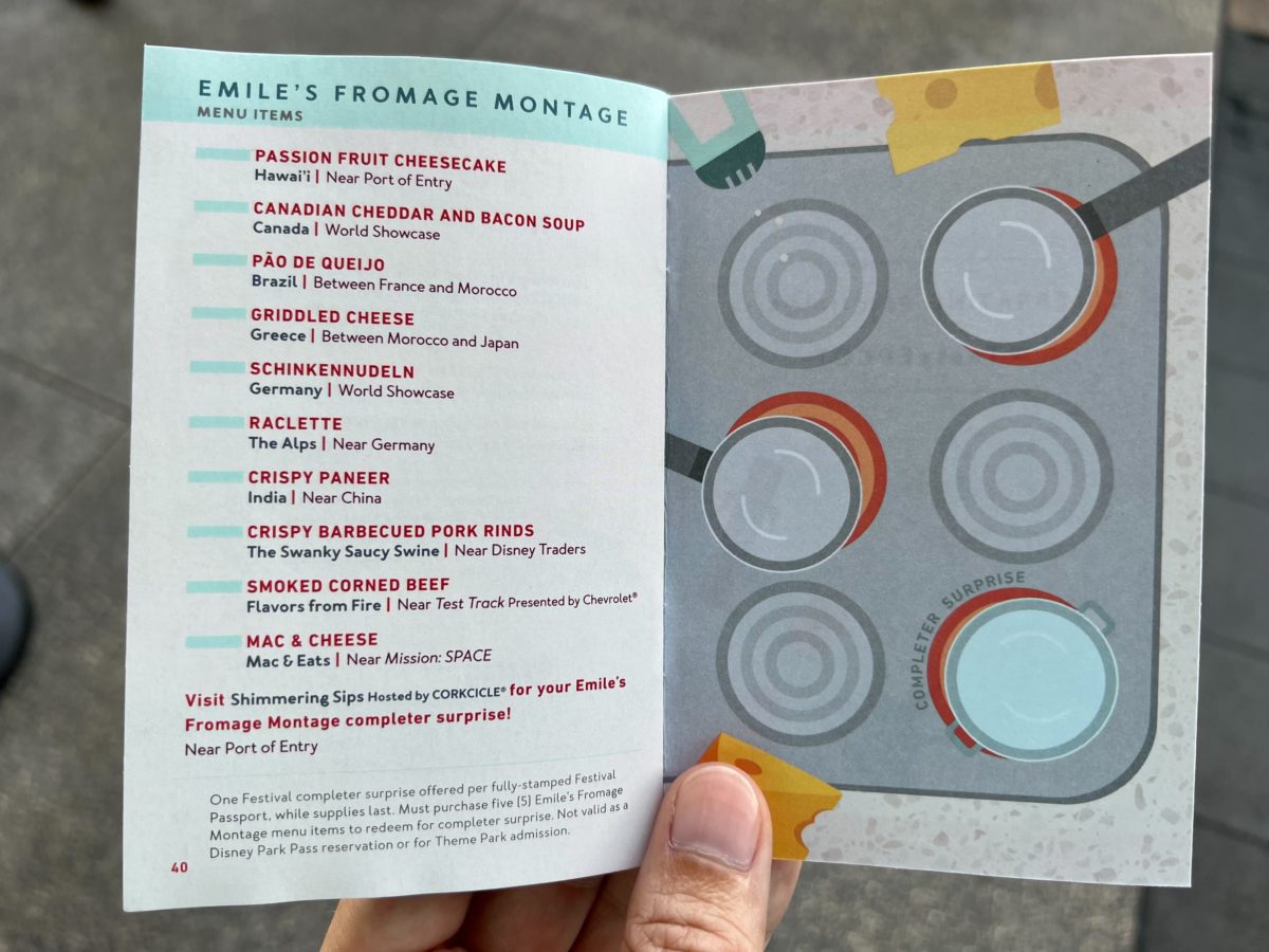 Emile’s Fromage Montage has returned for the 2022 EPCOT International Food & Wine Festival. This scavenger hunt encourages guests to purchase specific menu items at select booths to earn a prize.