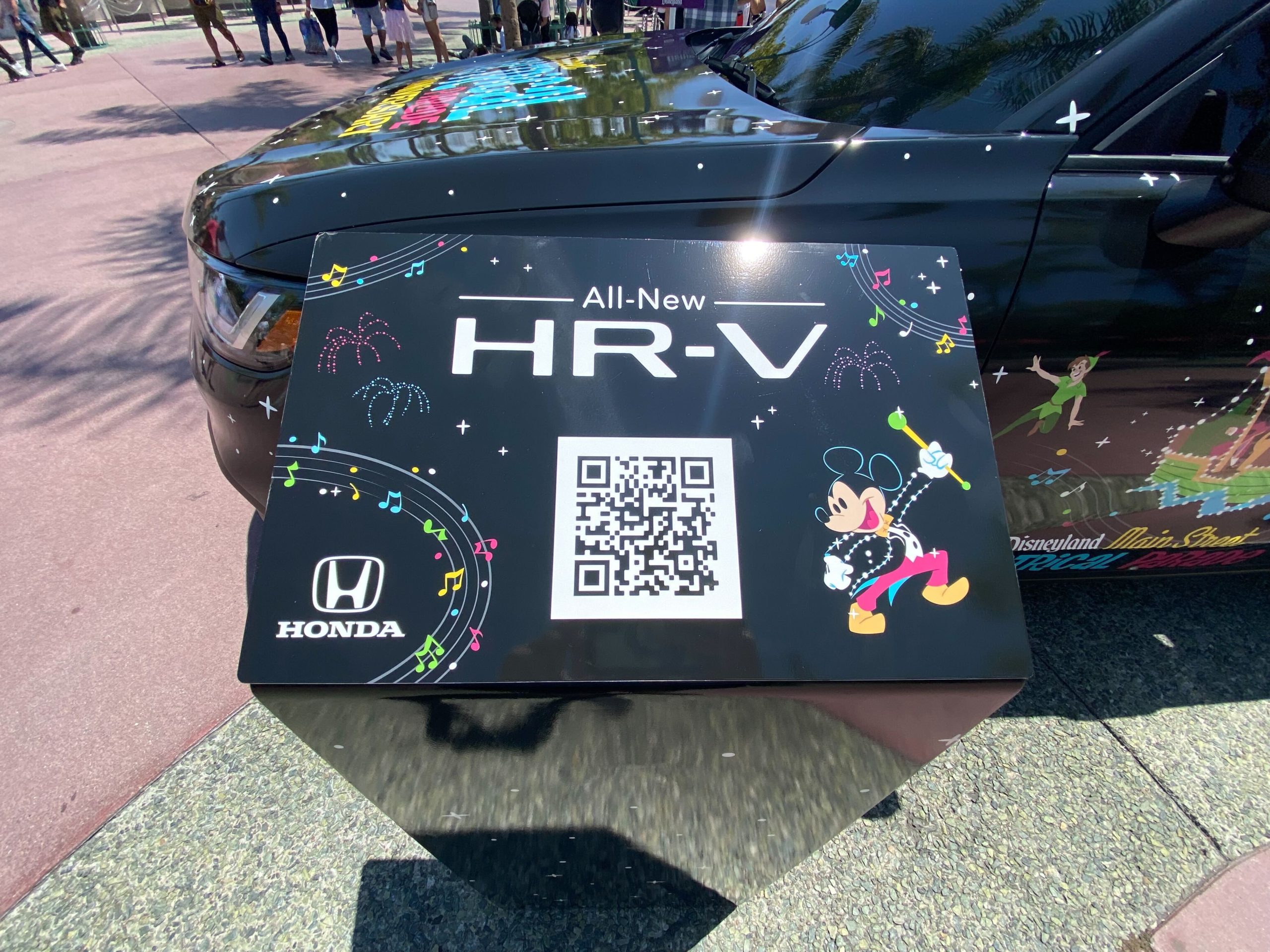 The sign features Mickey leading the parade as well as fireworks and colorful music notes. Scanning the QR code leads to Honda’s website.