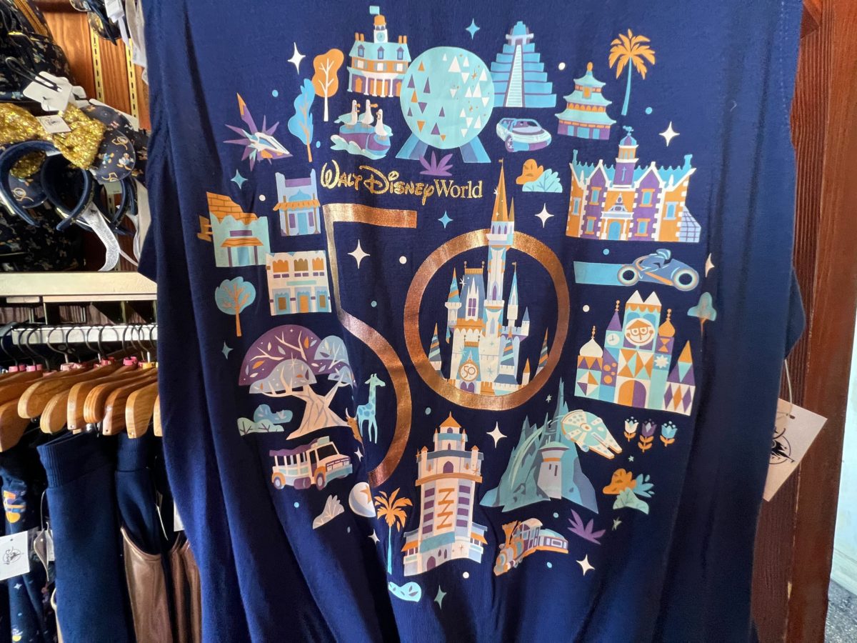The logo is surrounded by images of various Walt Disney World park icons. Cinderella Castle is in the zero of “50.” Also pictured is Spaceship Earth, “it’s a small world,” The Twilight Zone Tower of Terror, and the Tree of Life — all in the gold, purple, and blue colors of the 50th anniversary.