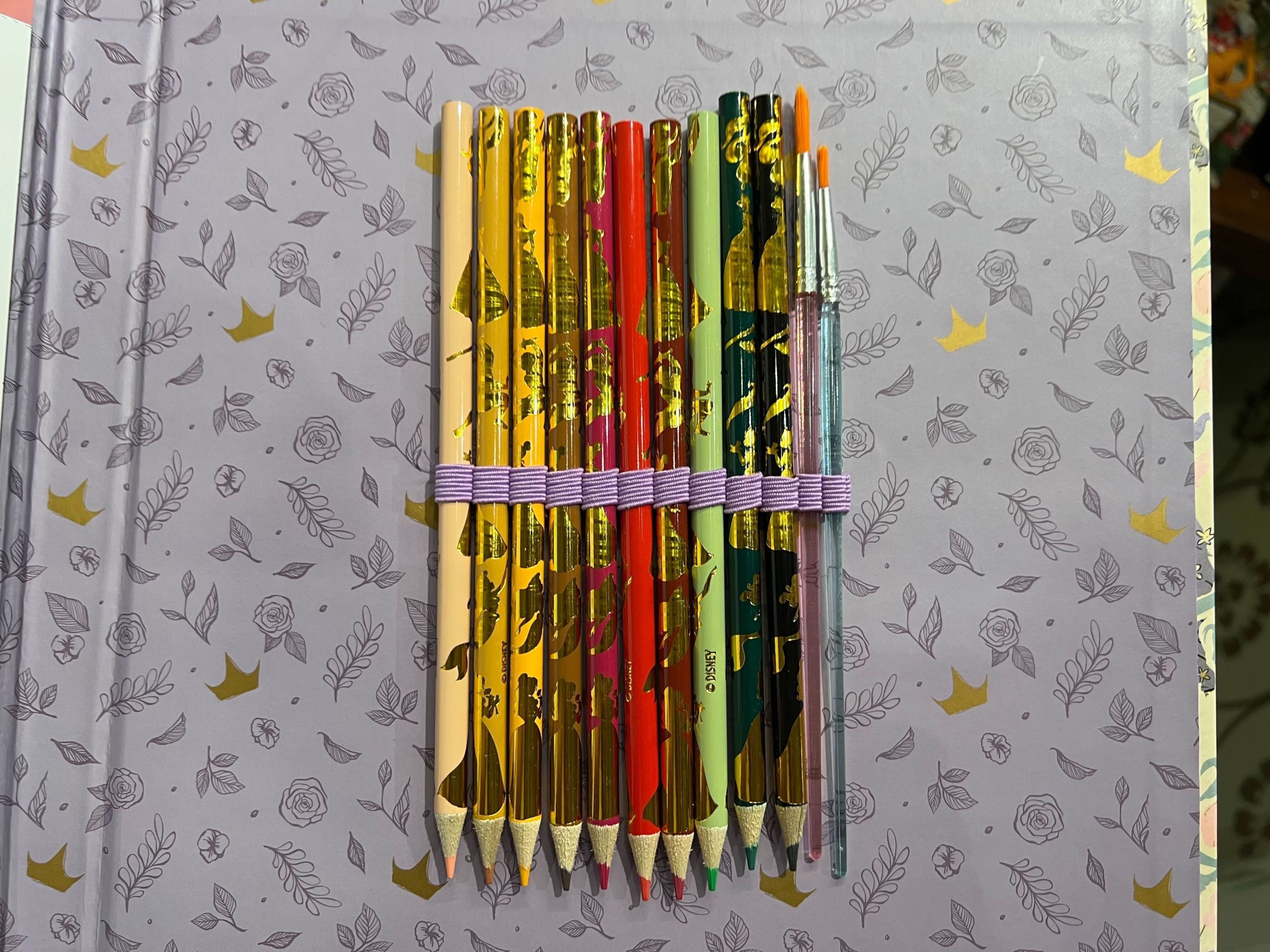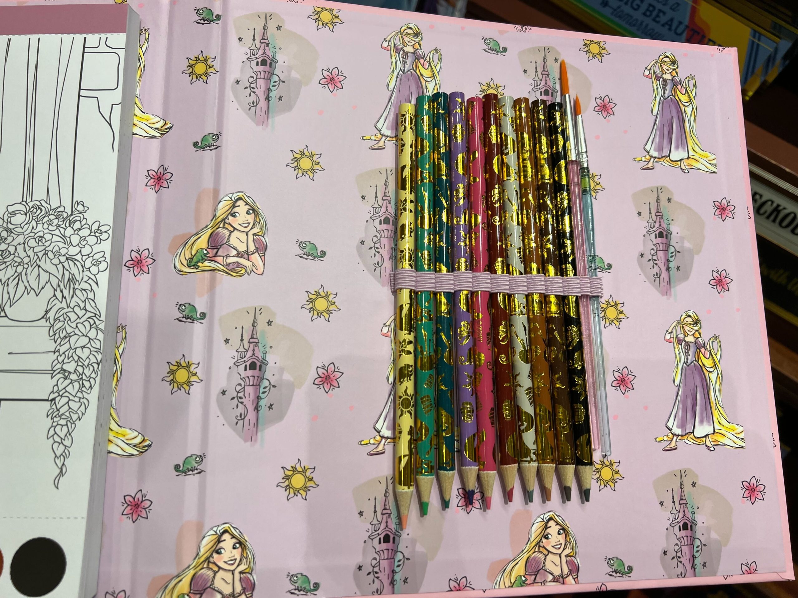 The pencils are covered in golden images of Rapunzel, lanterns, and flowers.