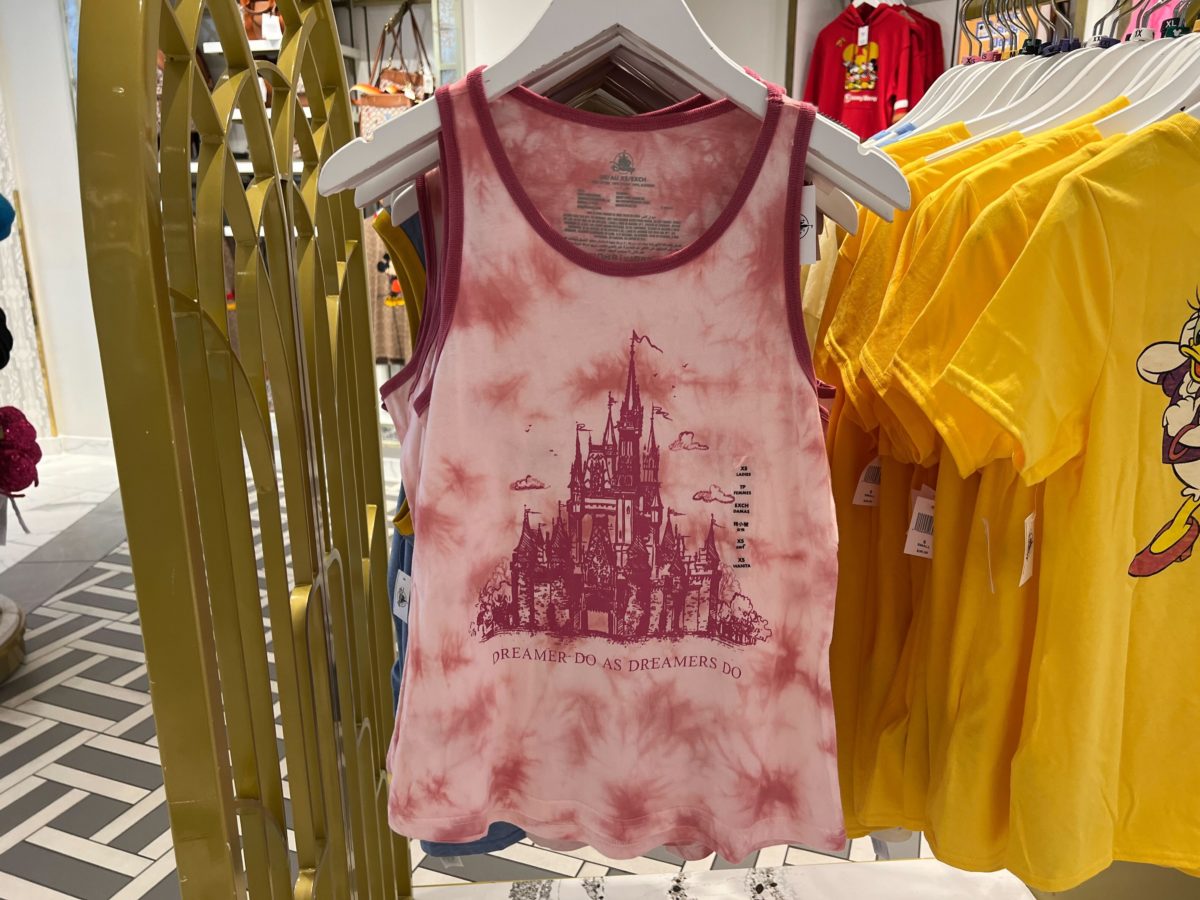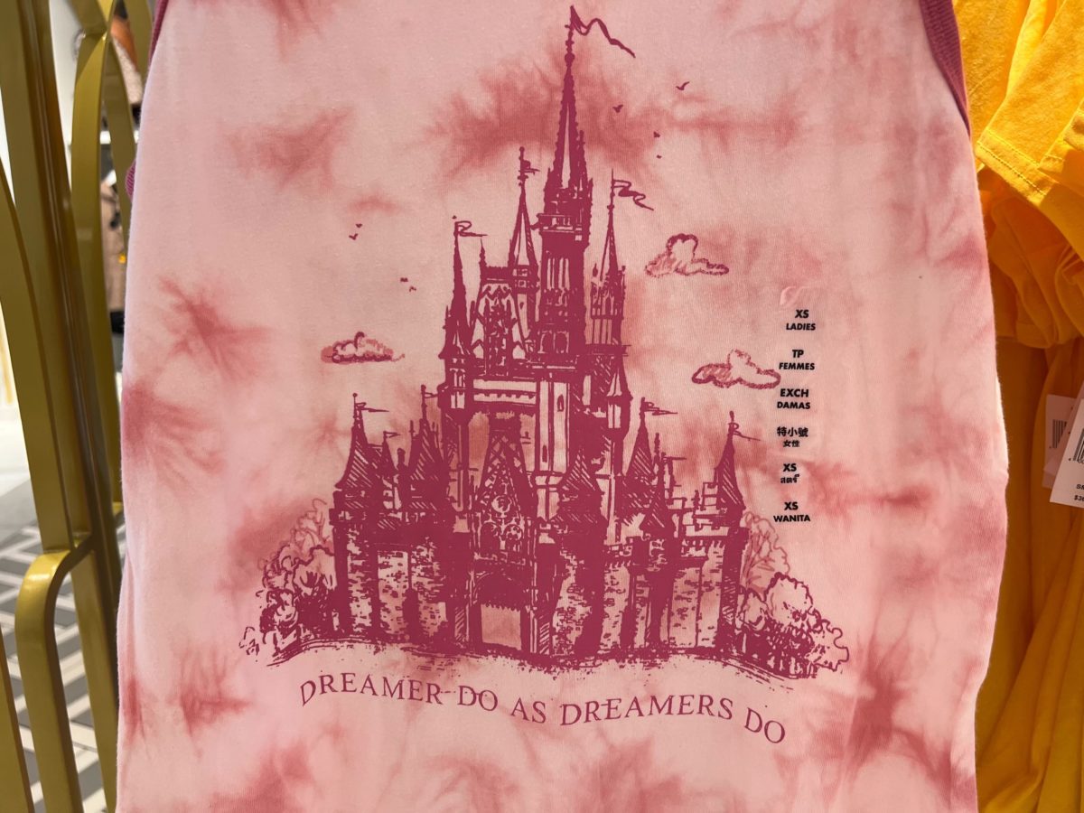 It features an intricate dark pink sketch of Cinderella Castle, with clouds and trees around it. “Dreamer do as dreamers do” are printed at the bottom.