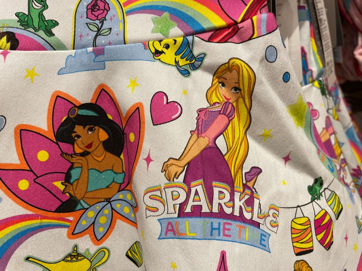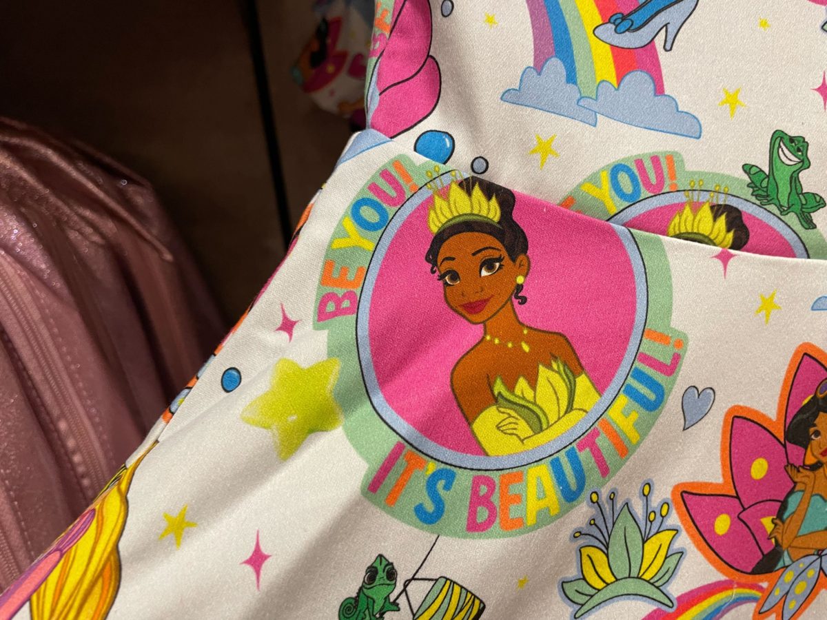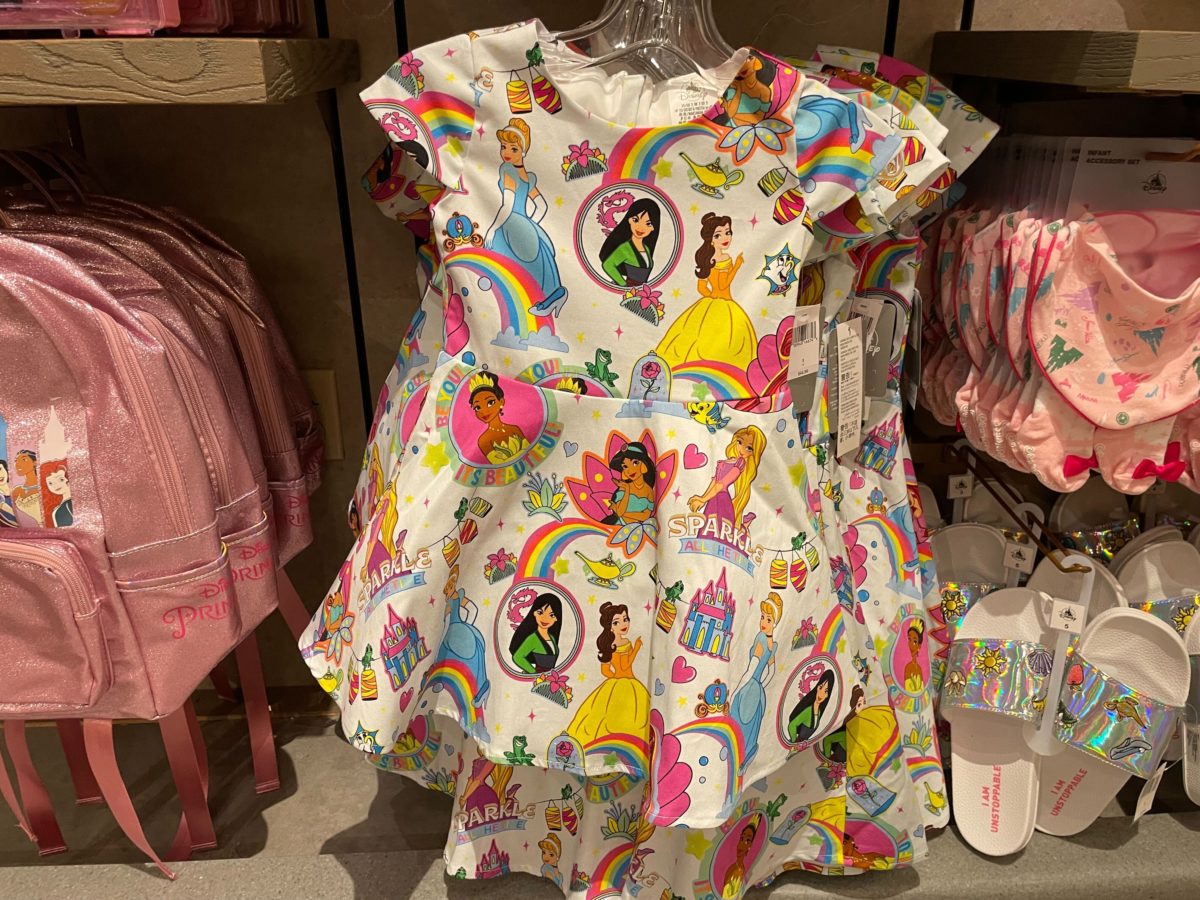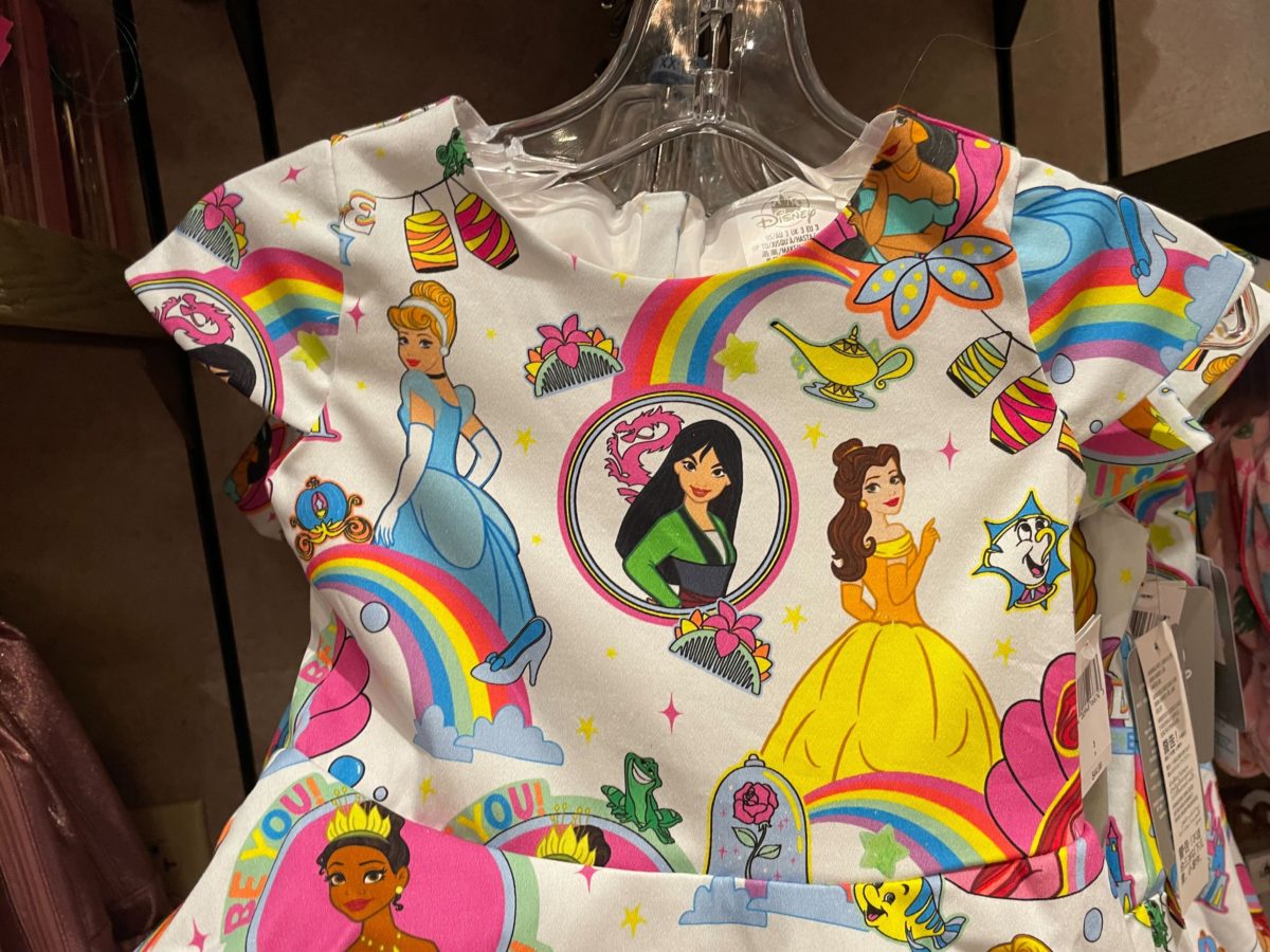 This dress is white with a colorful all-over pattern of Disney Princesses, castles, rainbows, and more.