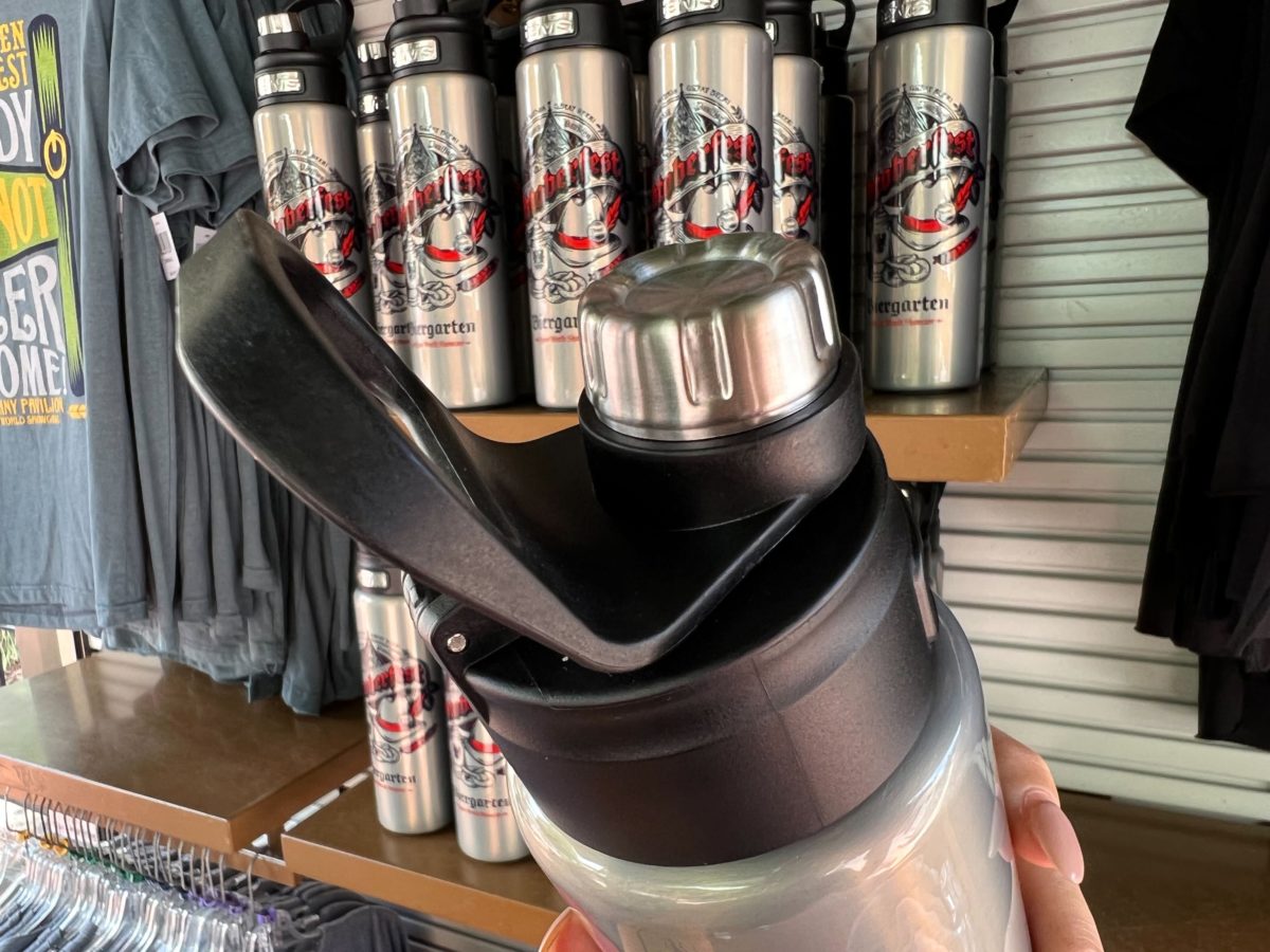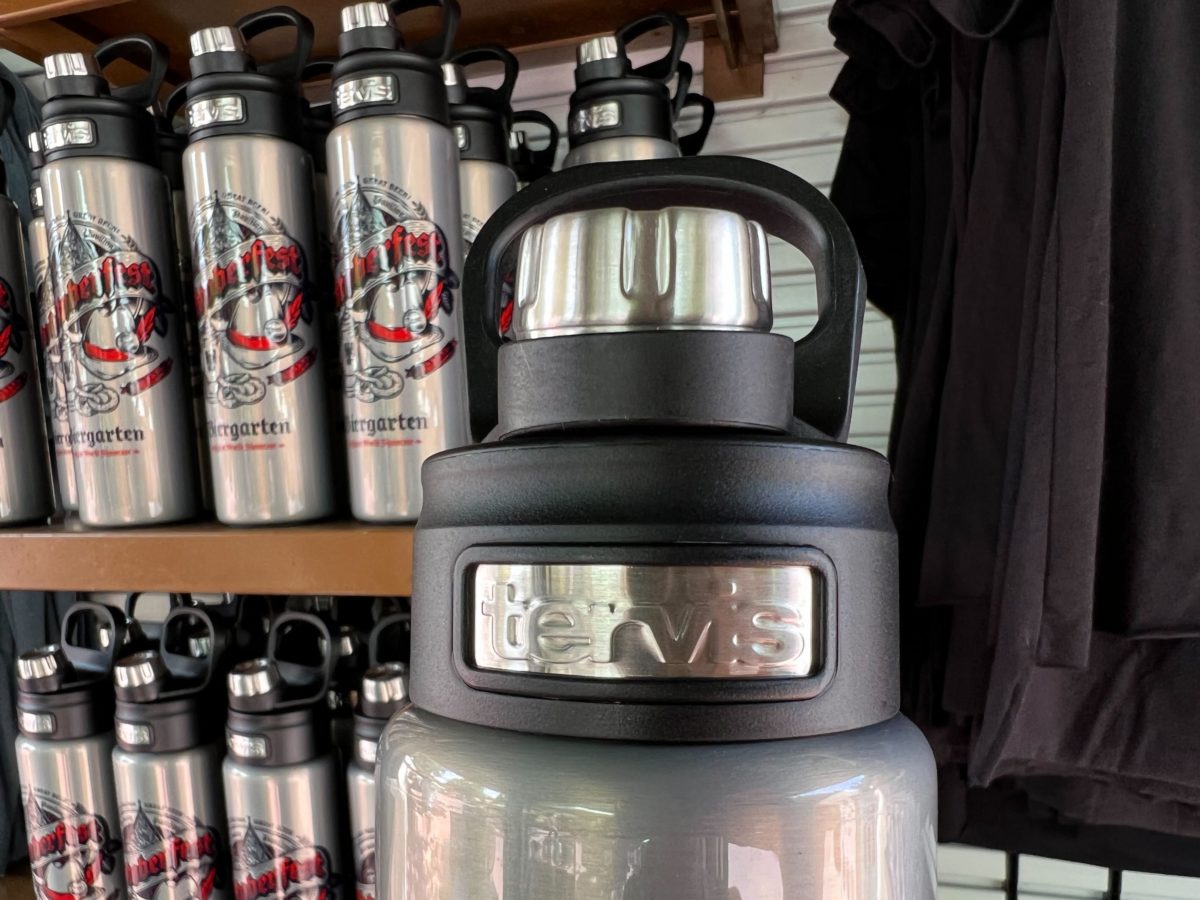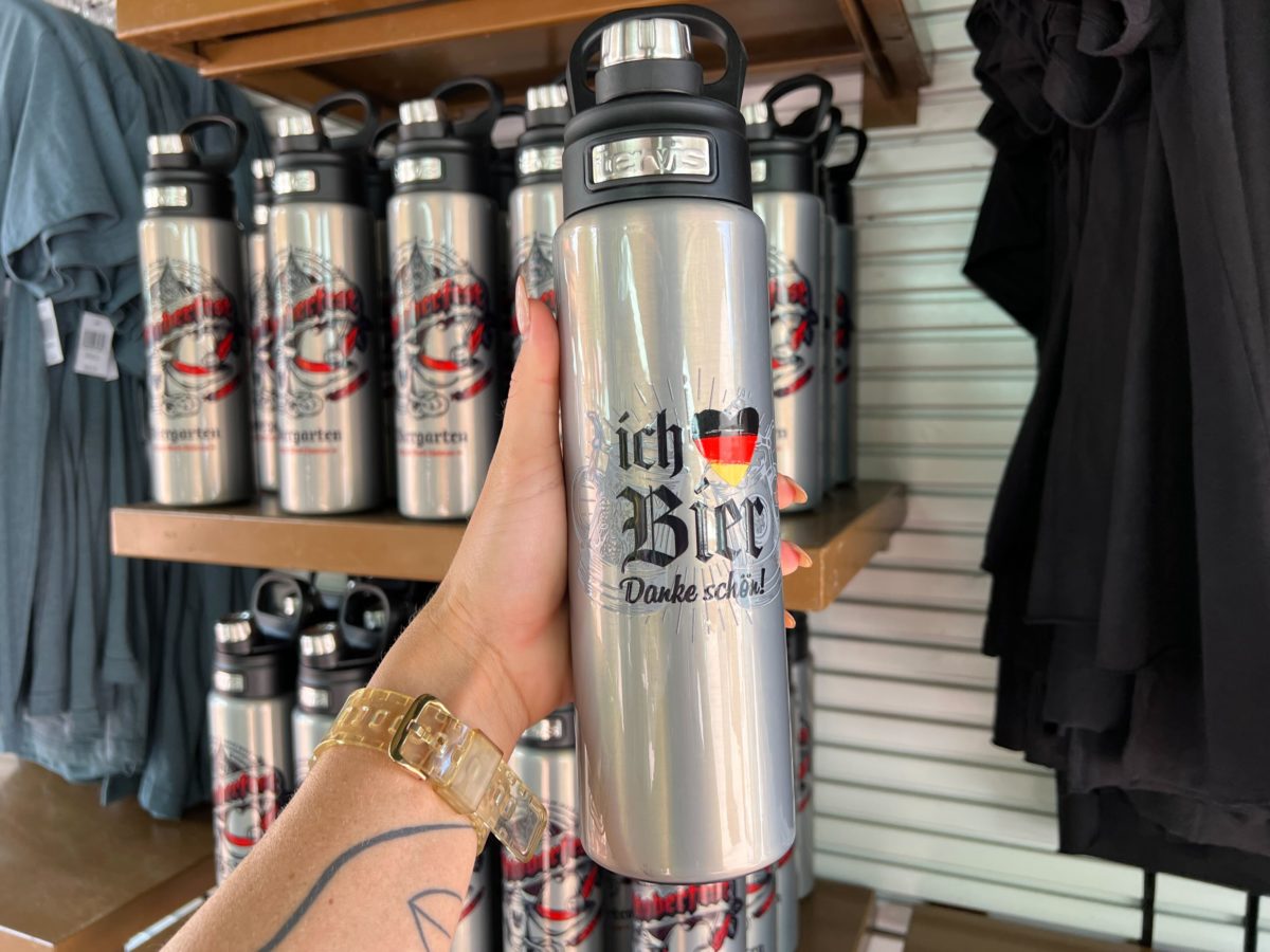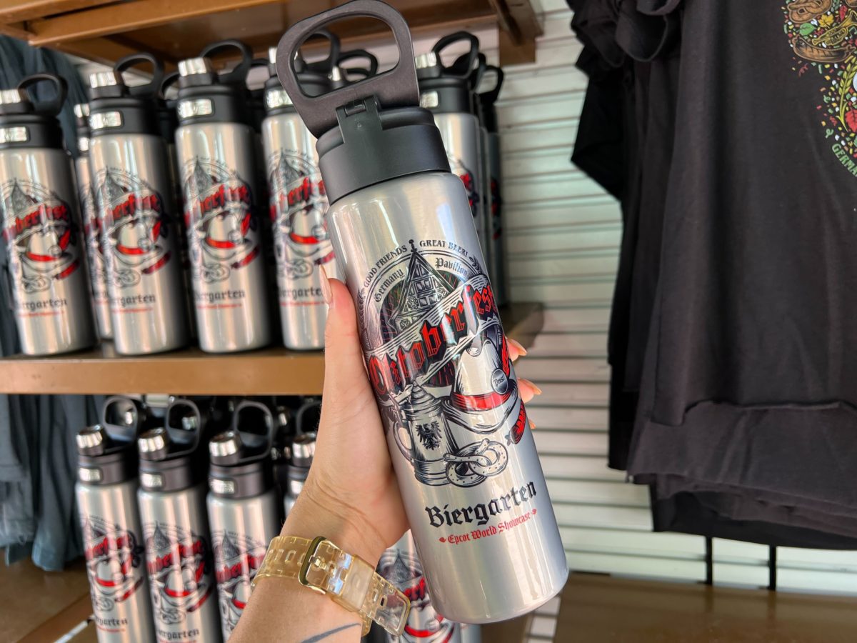 On one side of this stainless steel bottle is an Oktoberfest banner above images of an alpine hat, beer mug, and pretzel.