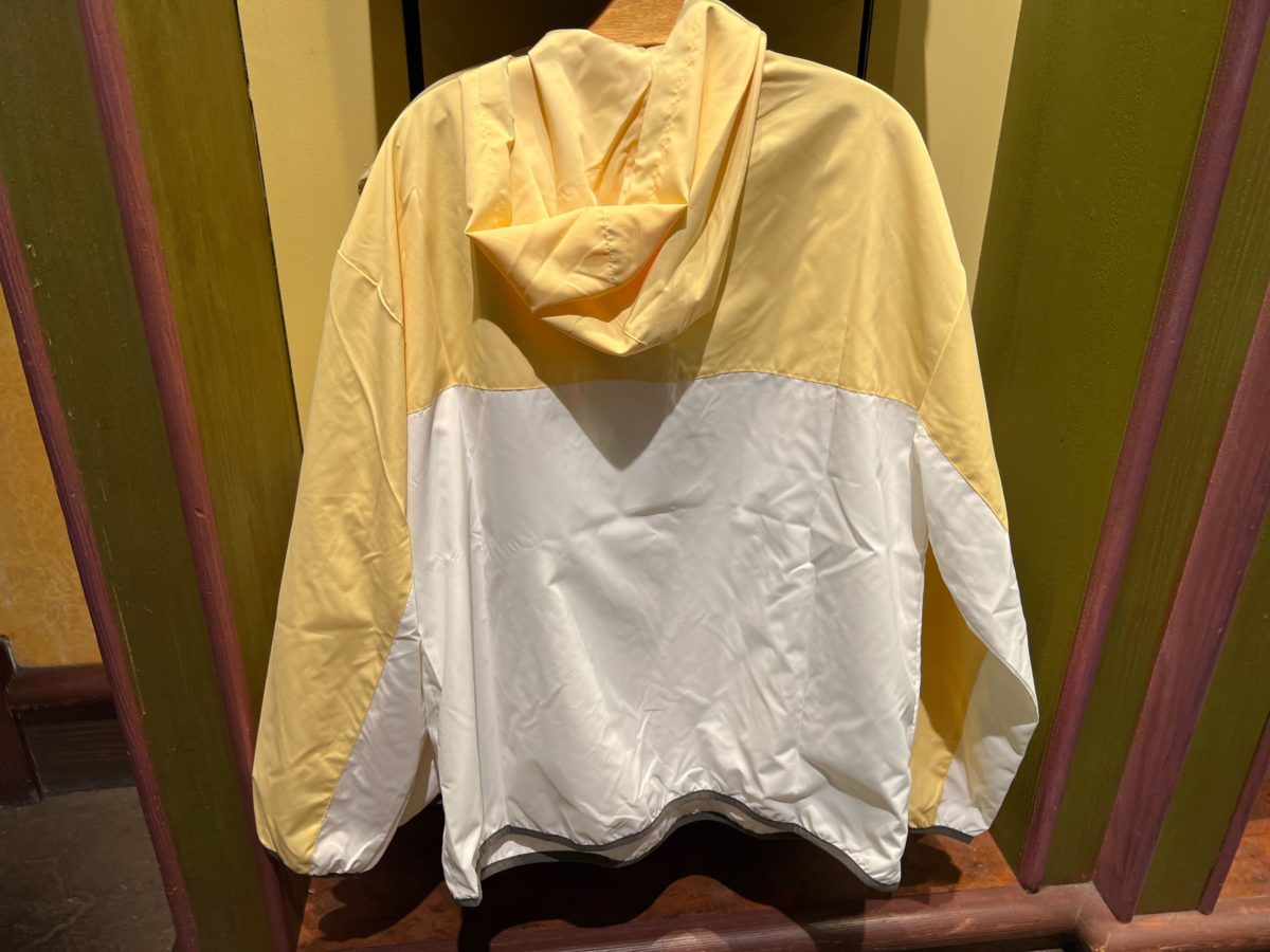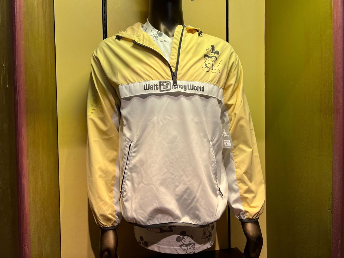 The windbreaker has a white torso, with a yellow yoke and sleeves. “Walt Disney World” is across the chest. Mickey is on the left breast.