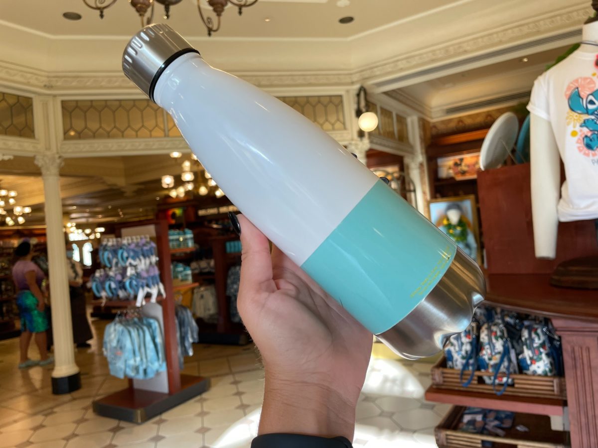 This water bottle is white and teal green, with an image of Minnie Mouse in her classic daisy hat and polka-dirt skirt.