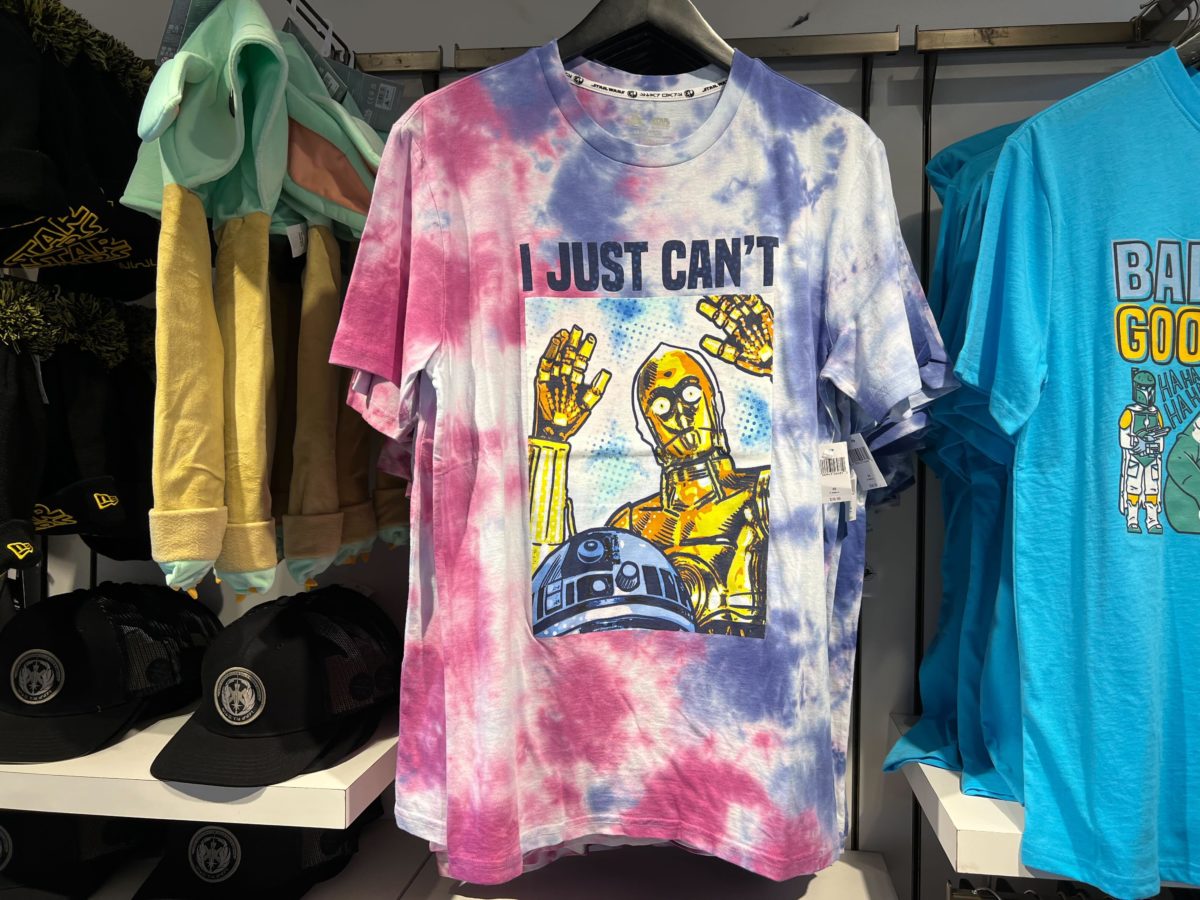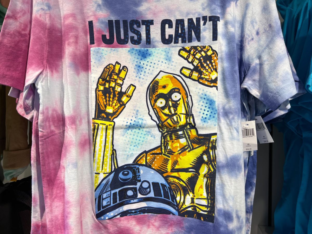 It is white with pink and purple tie-dye, mostly split down the middle. C-3PO and R2-D2 are in the center, and “I just can’t” is above them.