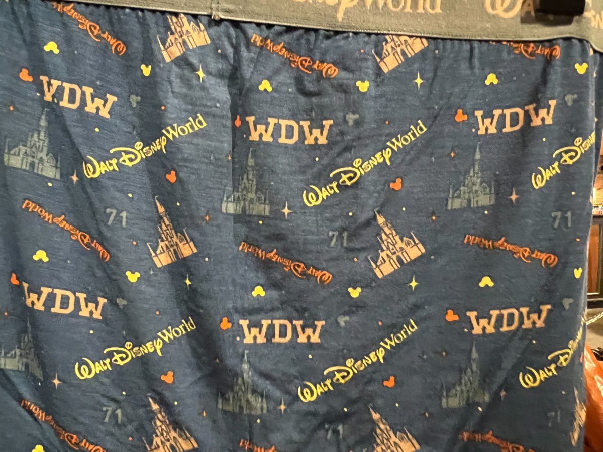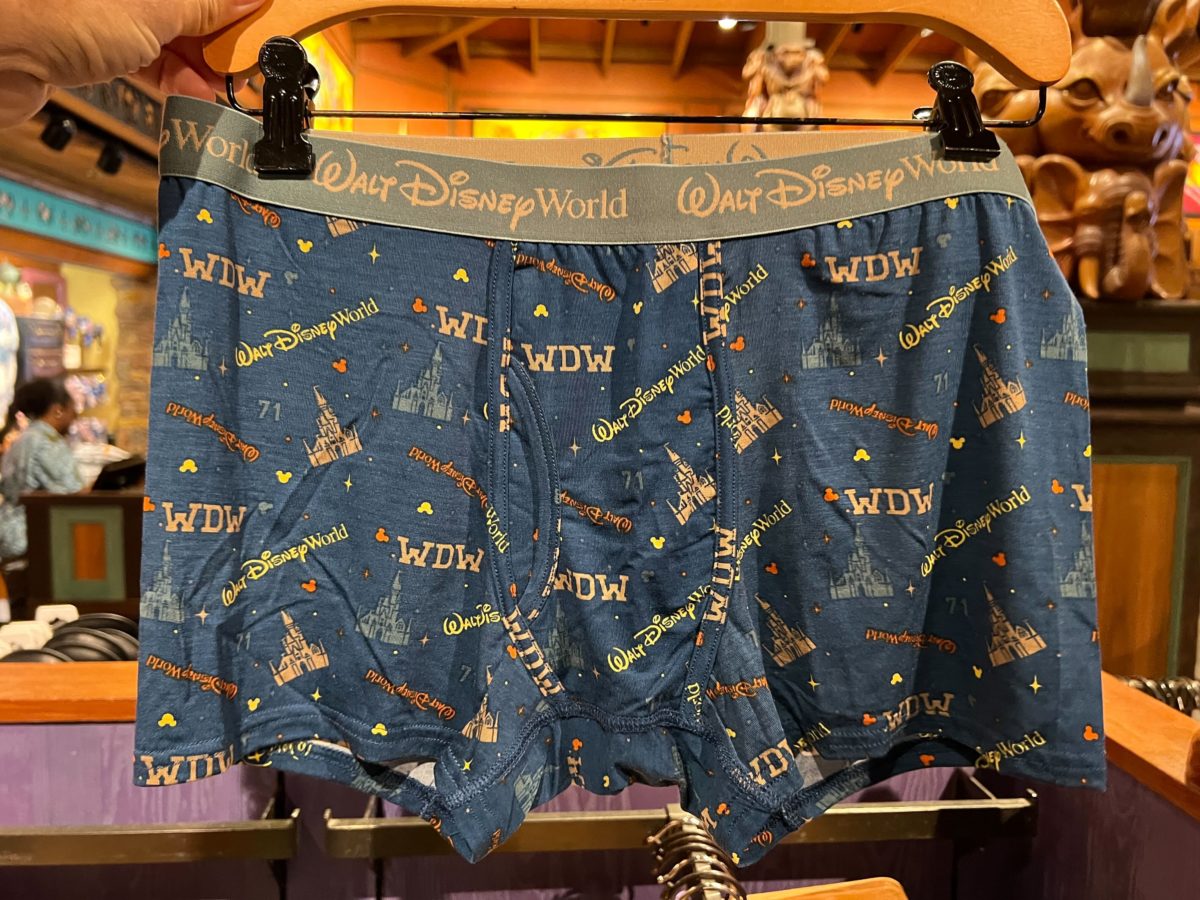 These boxers are blue with an all-over pattern of Cinderella Castle, Mickey heads, stars, “71,” “WDW,” and “Walt Disney World.”