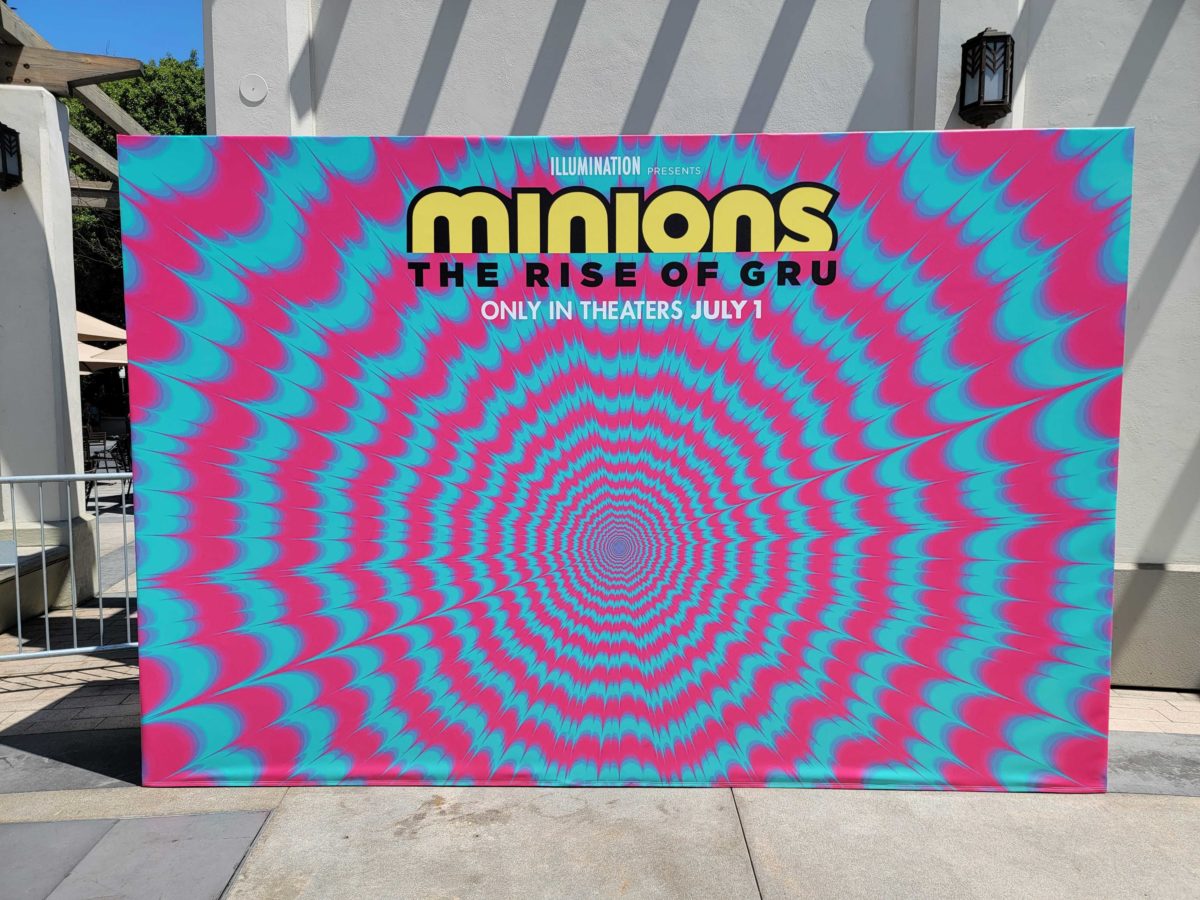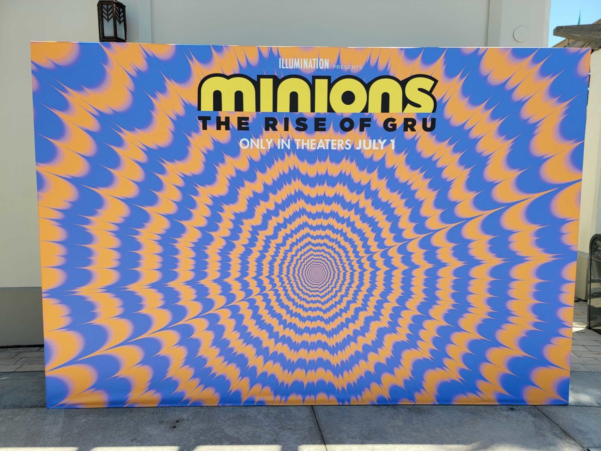 This one is orange and purple. Both advertise “Minions: The Rise of Gru,” in theaters on July 1. Minions will meet in front of them sometimes.
