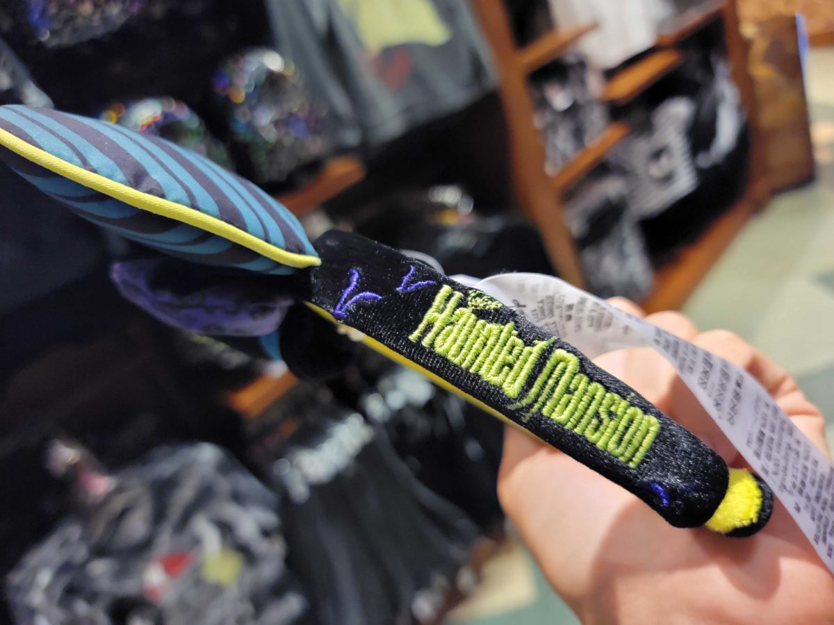 The Haunted Mansion logo is stitched alongside purple bats on the left side of the band.
