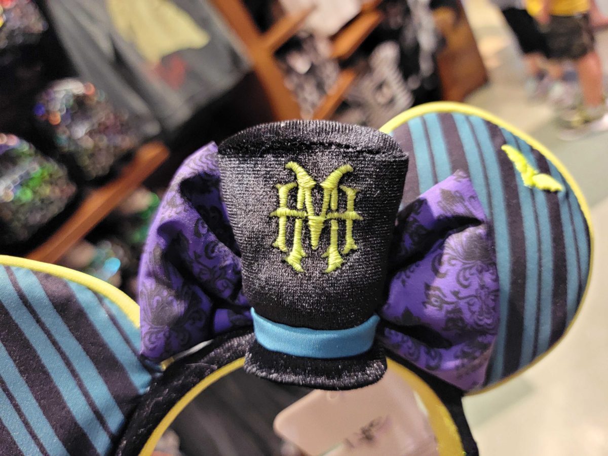 Minnie’s bow in the center is purple wallpaper patterned. In front of the bow sits a top hat with the HM monogram on the front.
