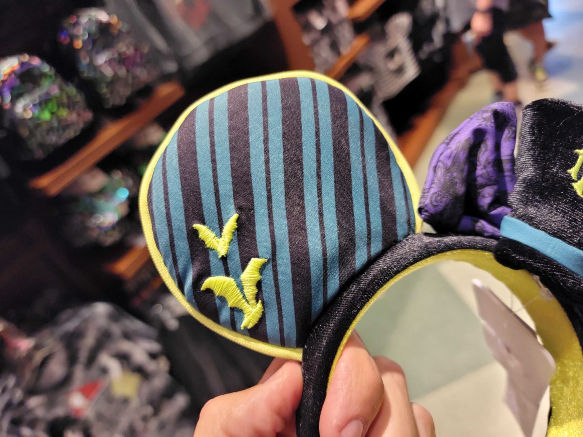 The ears feature the same blue and black pinstriping as the butlers’ uniforms. They are embroidered with neon green bats.