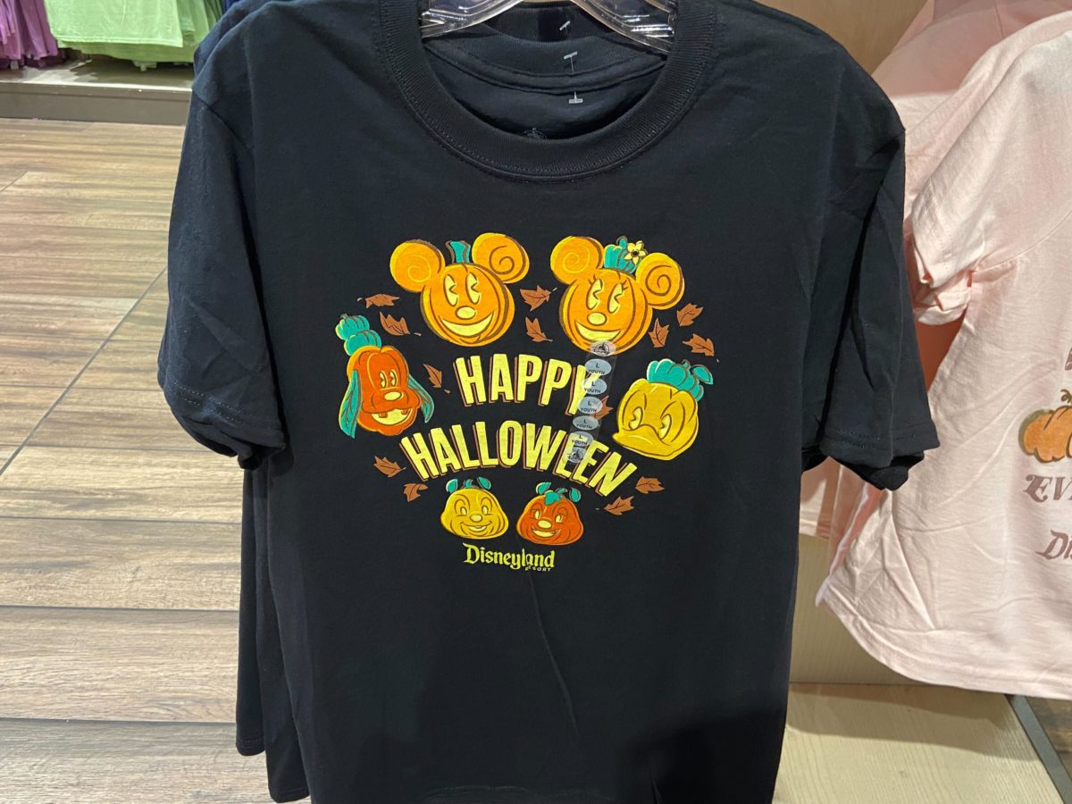 Leaves fall around each pumpkin character and the shirt reads “Happy Halloween” with the Disneyland logo.
