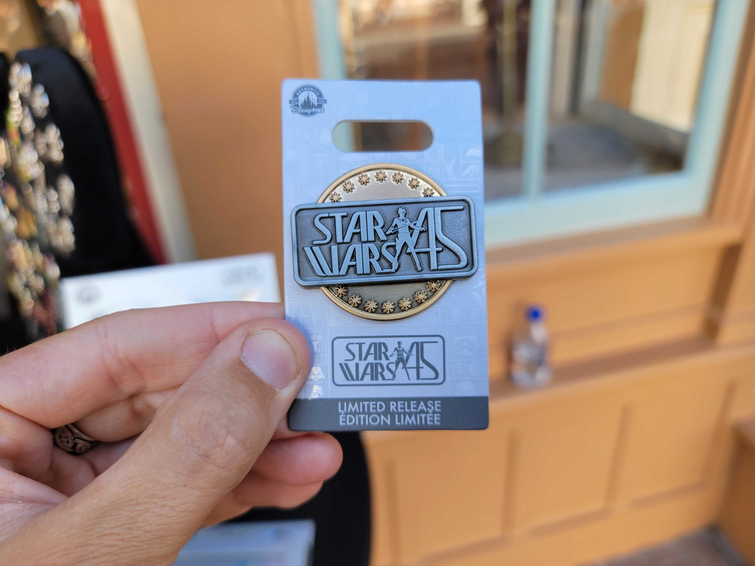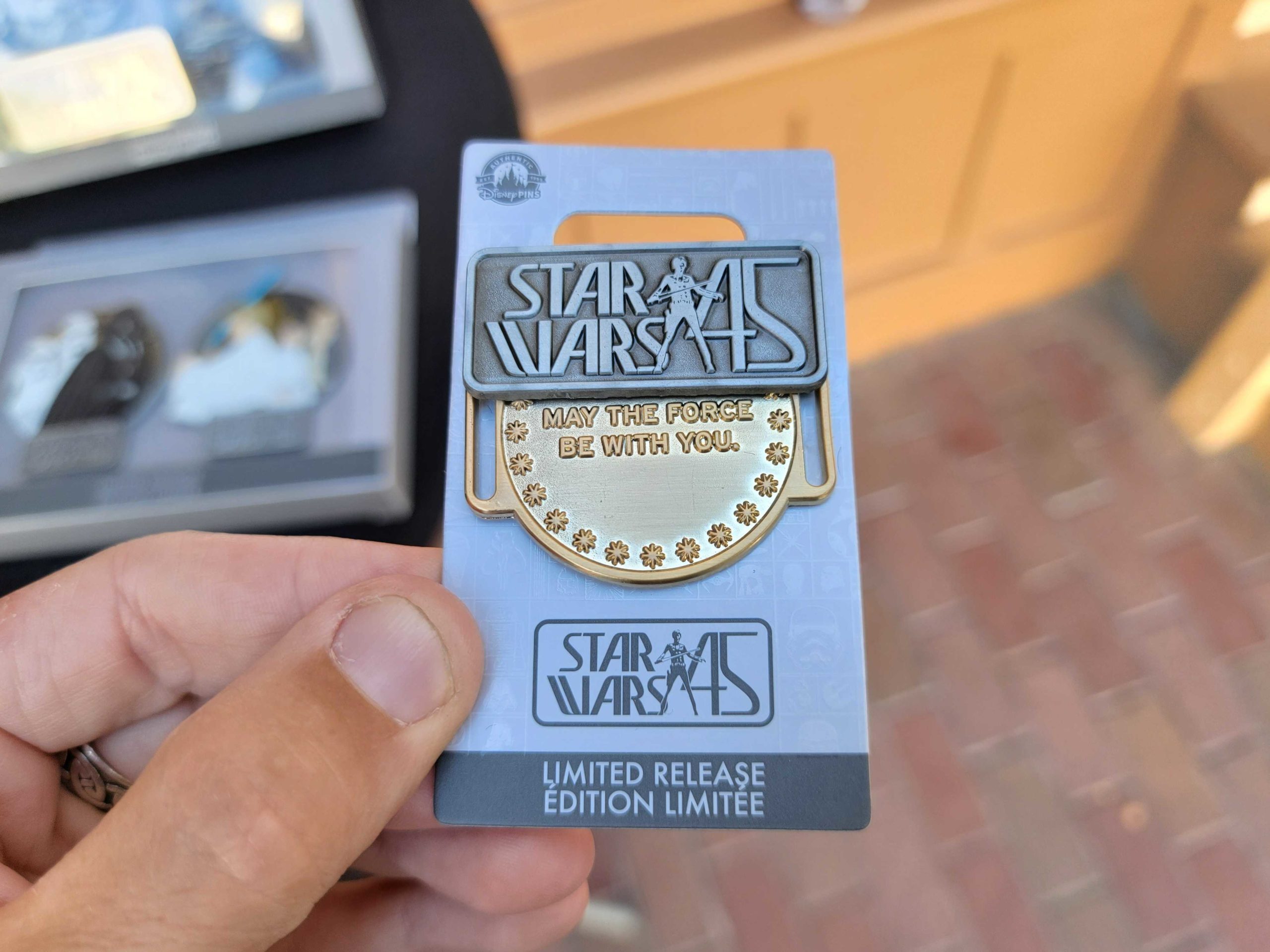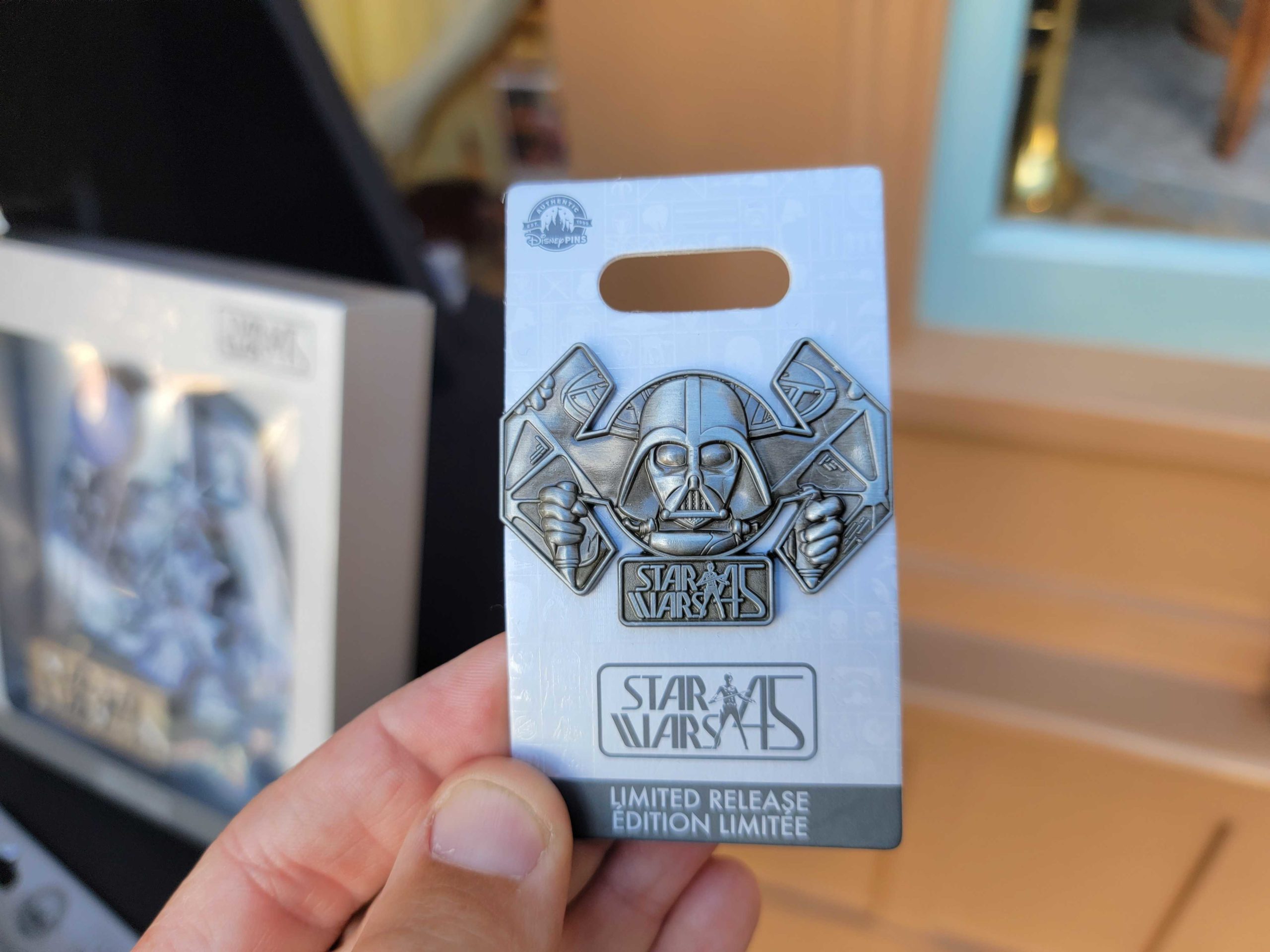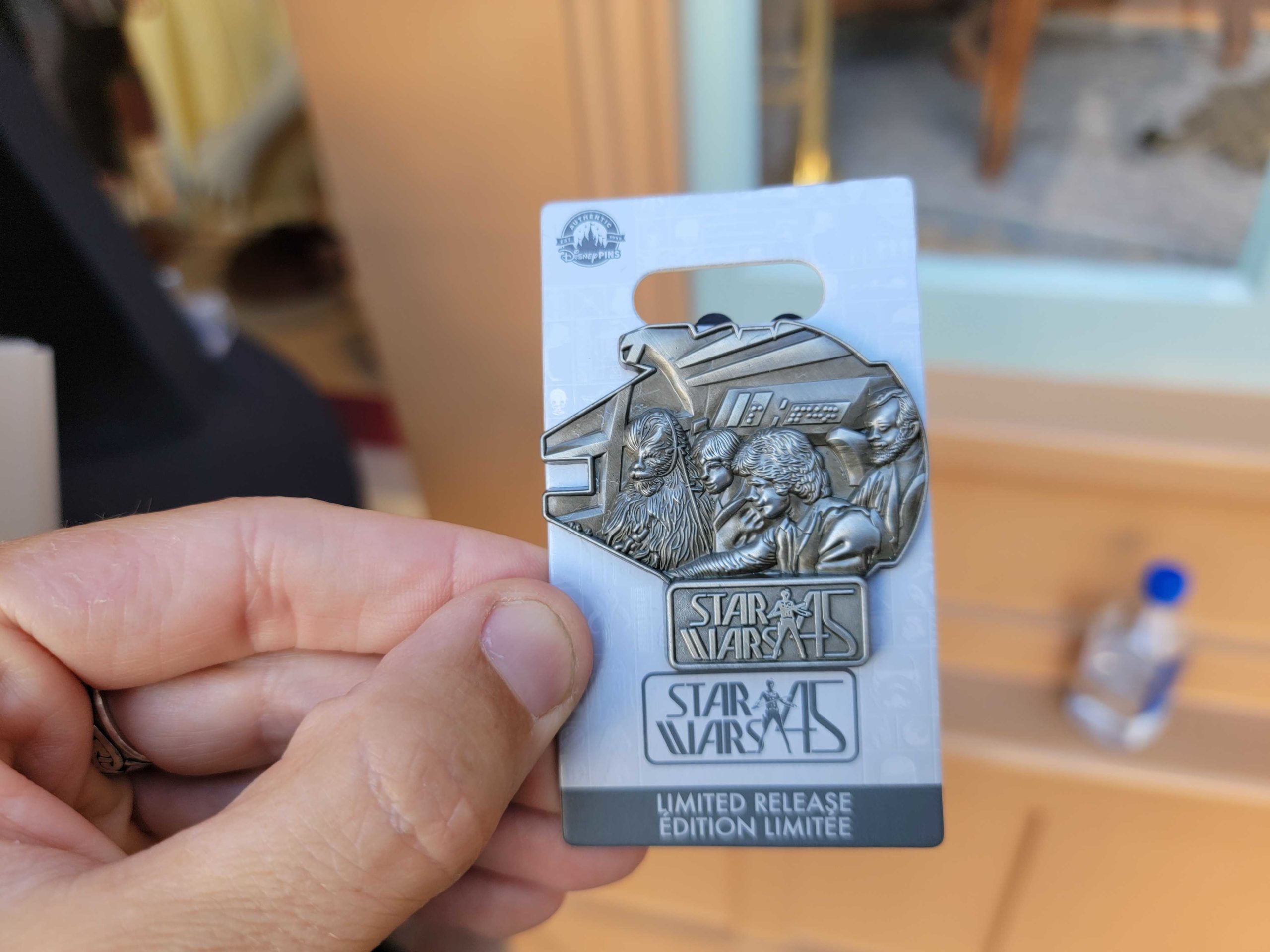 Finally, this “Star Wars” pin has a silver plate featuring the 45th anniversary logo atop a golden medallion.